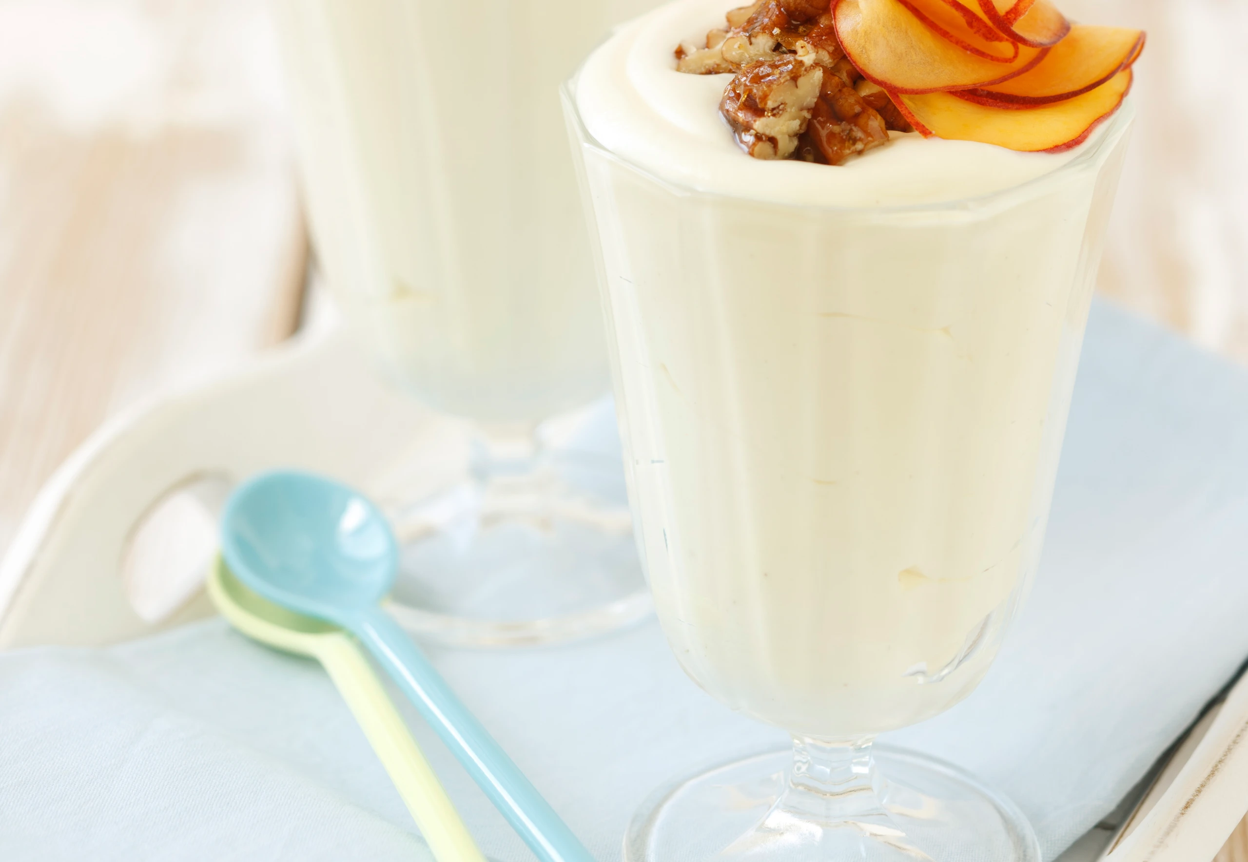 Creme in Gläser füllen, mit Pfirsichen und Karamellnüssen garnieren.