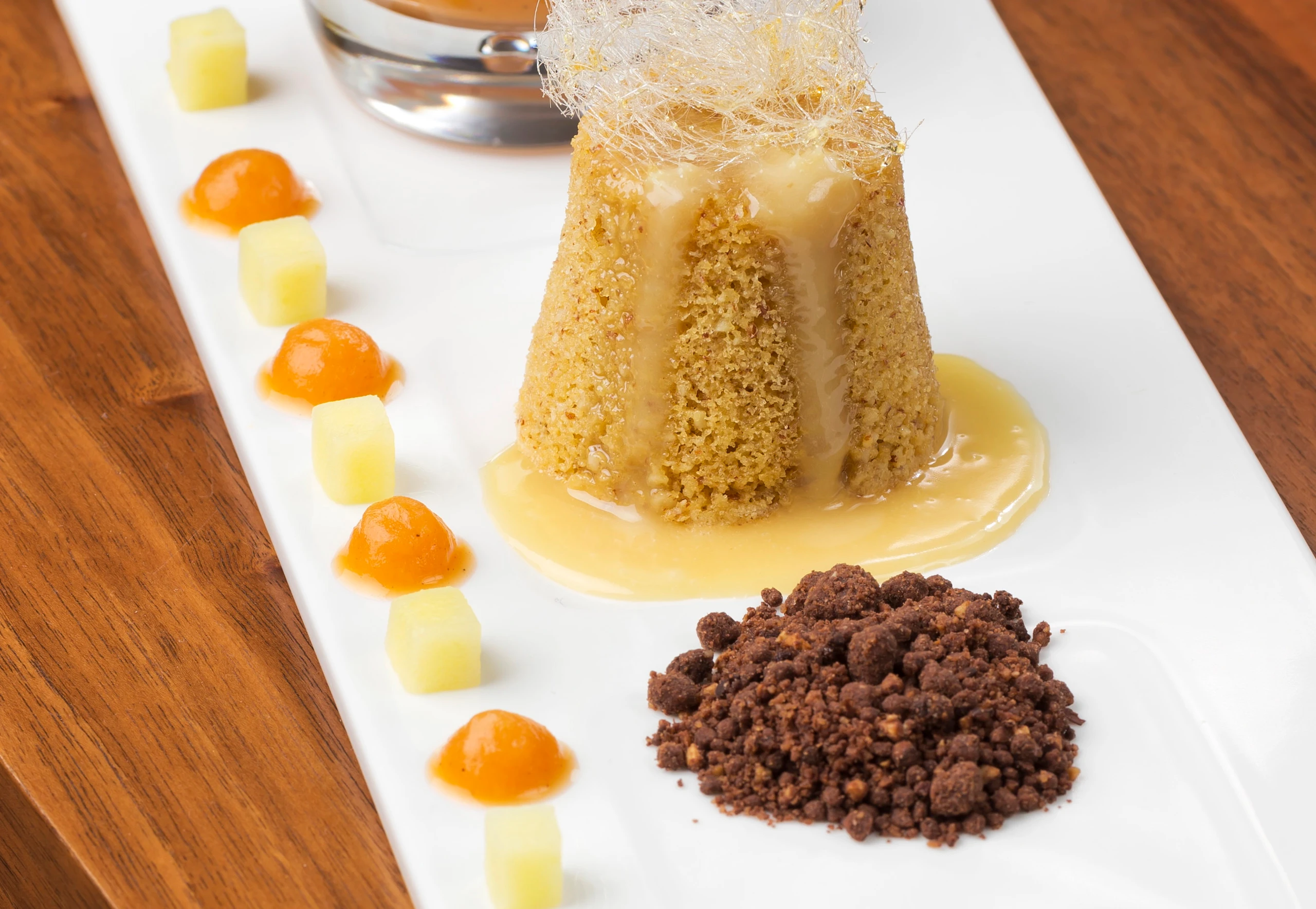 Aufläufe aus den Förmchen stürzen, mit Sauce, Apfelwürfeln, Mousse, Espuma und Schoko-Erde anrichten. Eventuell mit Apfel-Karottenmousse und gesponnenem Zucker garnieren.