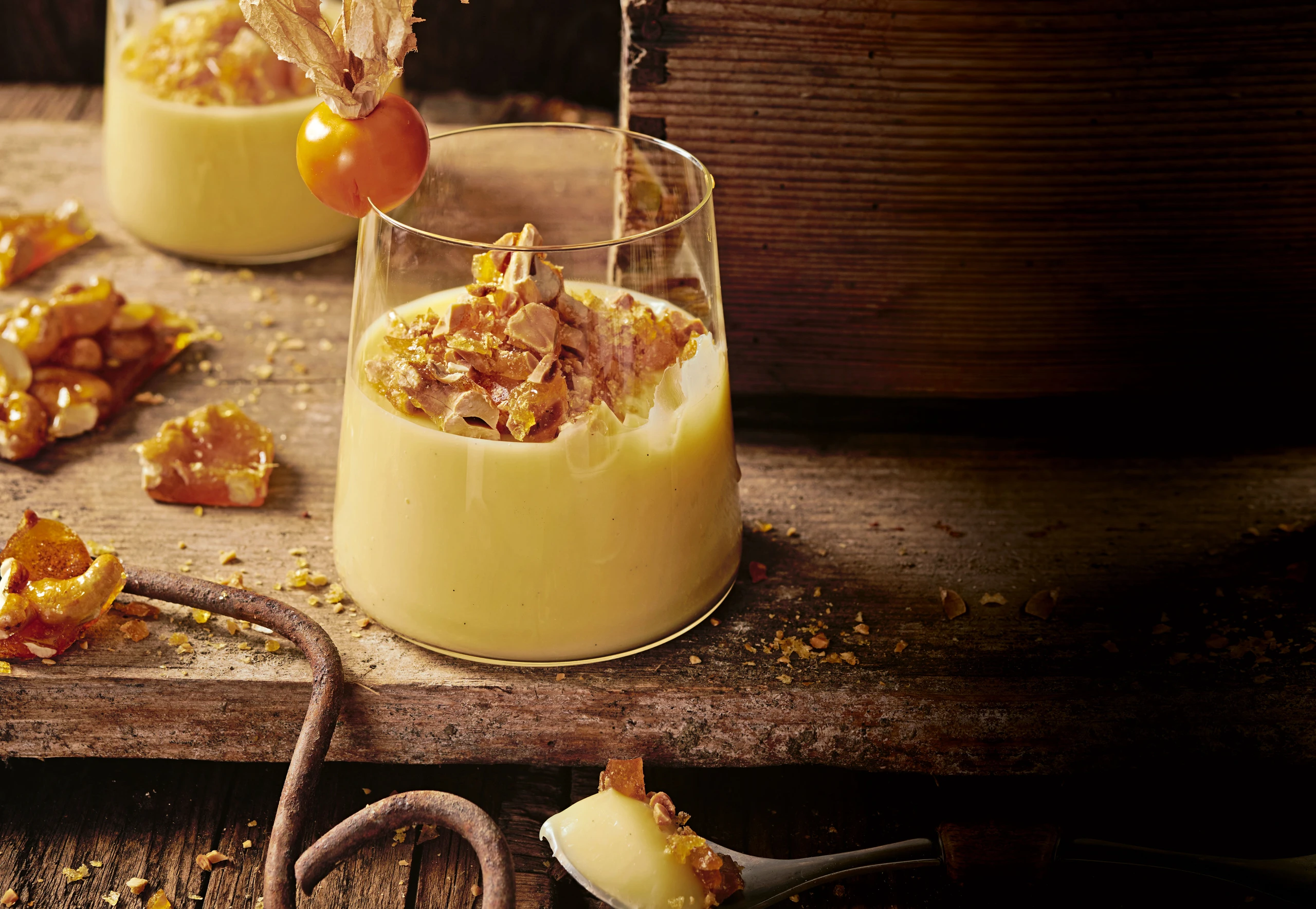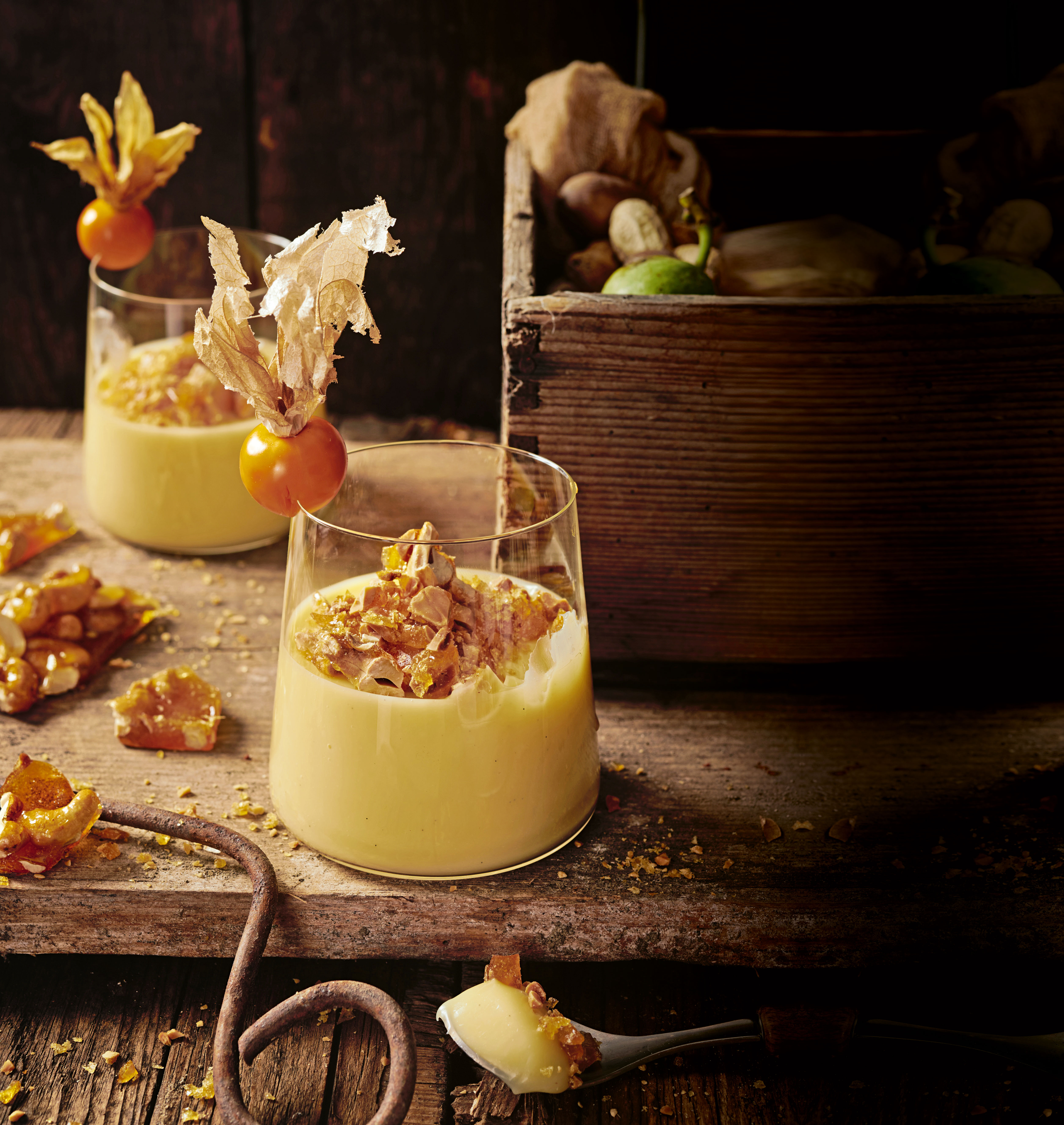 Krokant in Stücke brechen und in den Gläsern verteilen, mit Physalis garnieren.