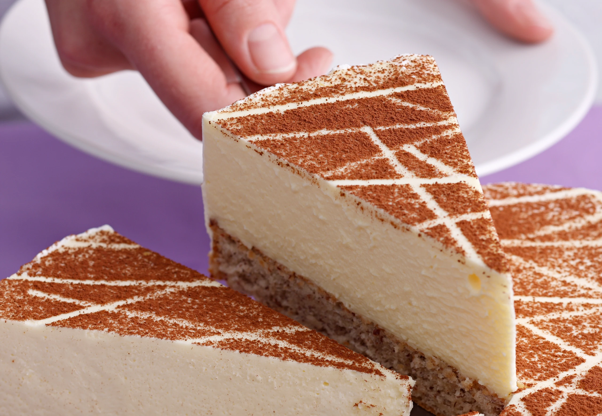 Garnitur: Holzspieße auf die Torte legen, mit Kakaopulver bestreuen, Spieße entfernen. Torte aus der Form heben und in Stücke schneiden.