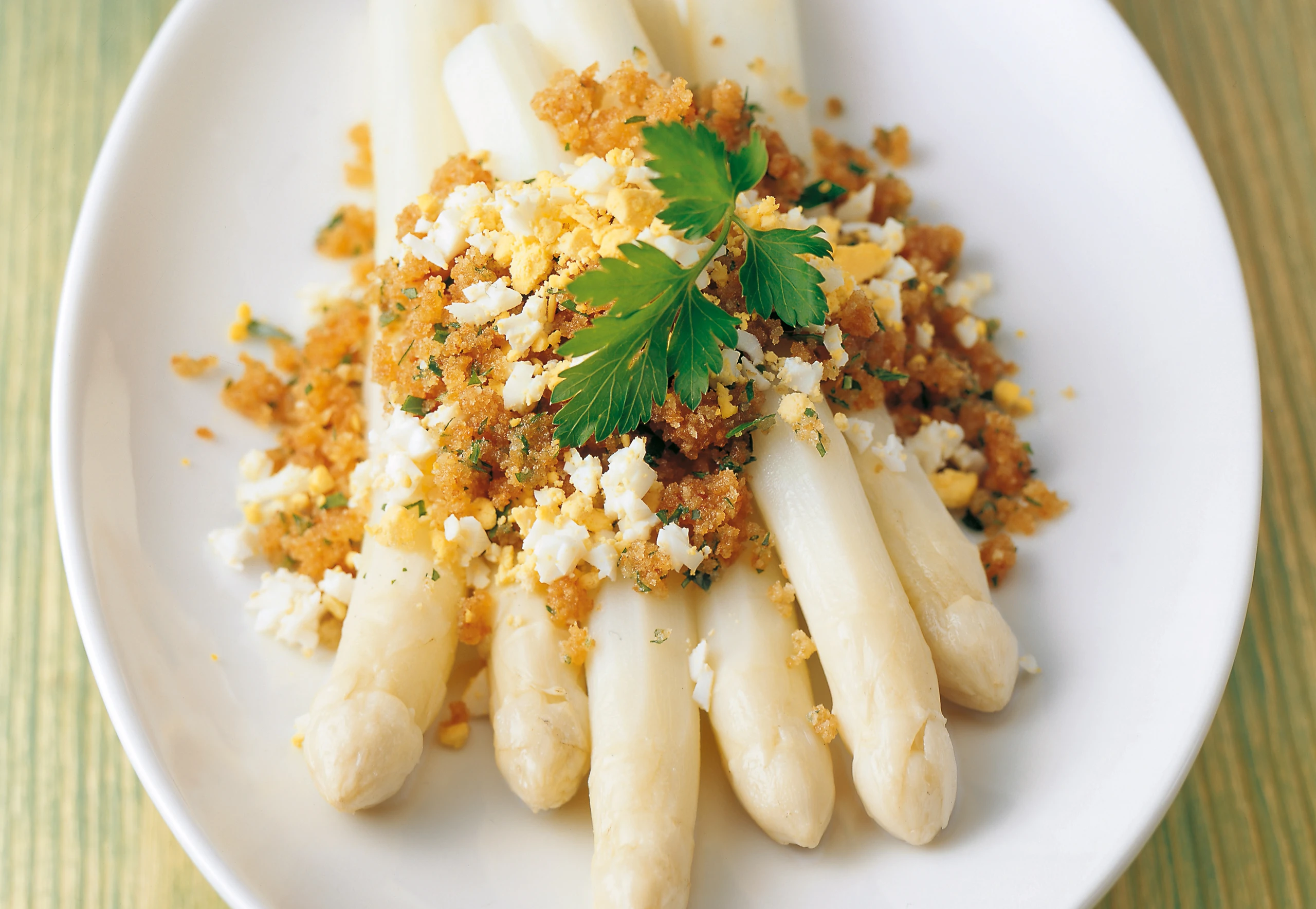 Spargel aus dem Fond heben, abtropfen lassen und mit den Bröseln anrichten.