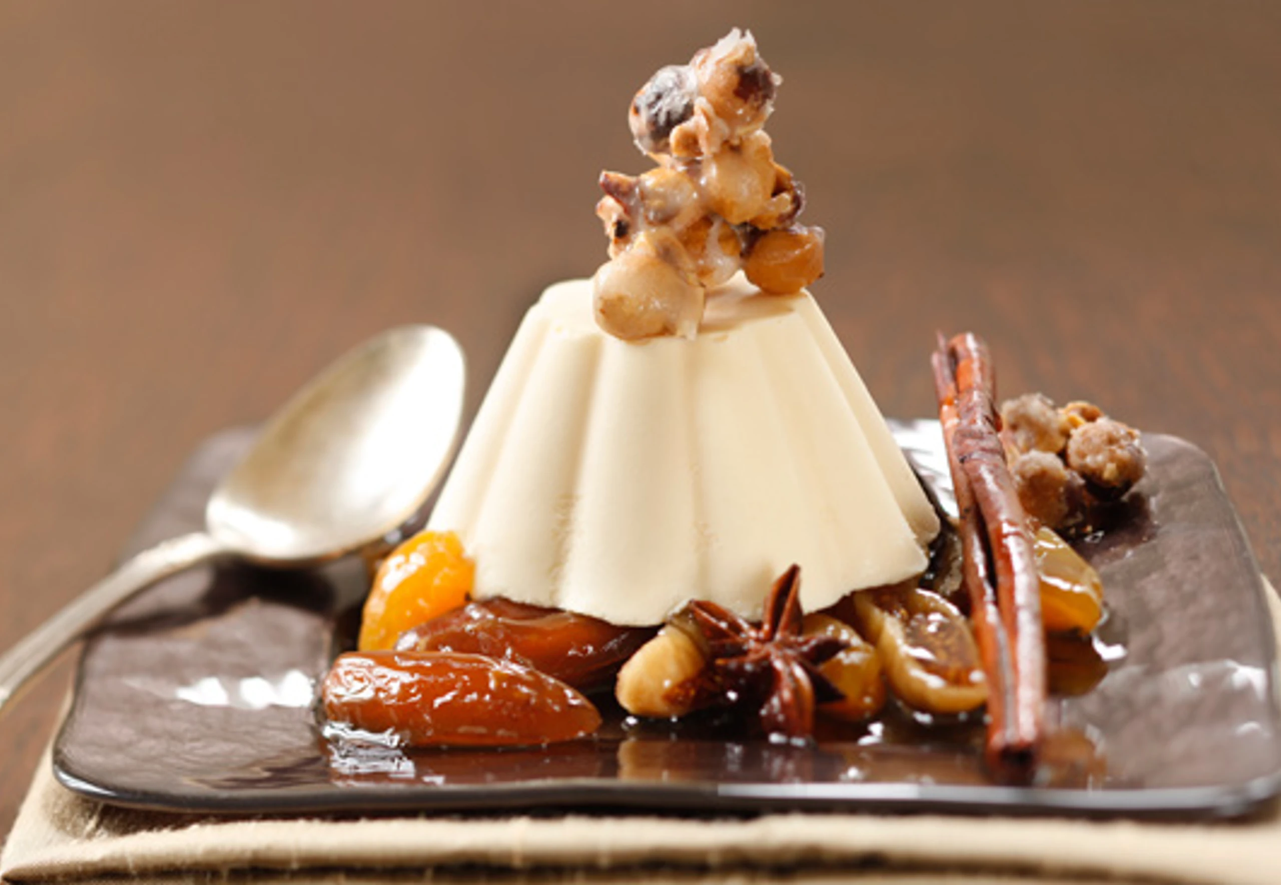 Weißes Kaffeeparfait mit Krokant und marinierten Trockenfrüchten