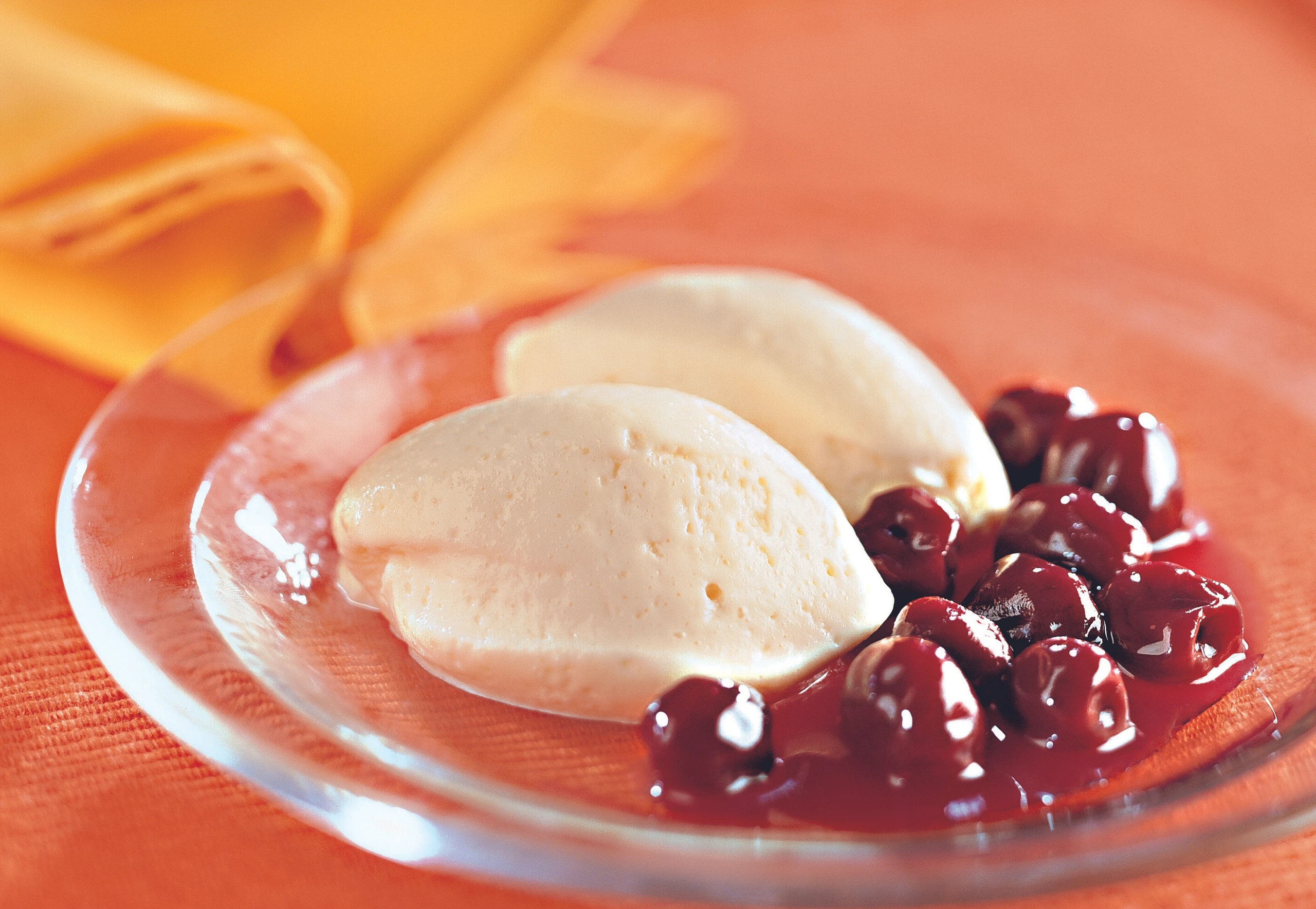 Aus der Mousse Nockerl ausstechen und mit den eingemachten Weichseln anrichten.