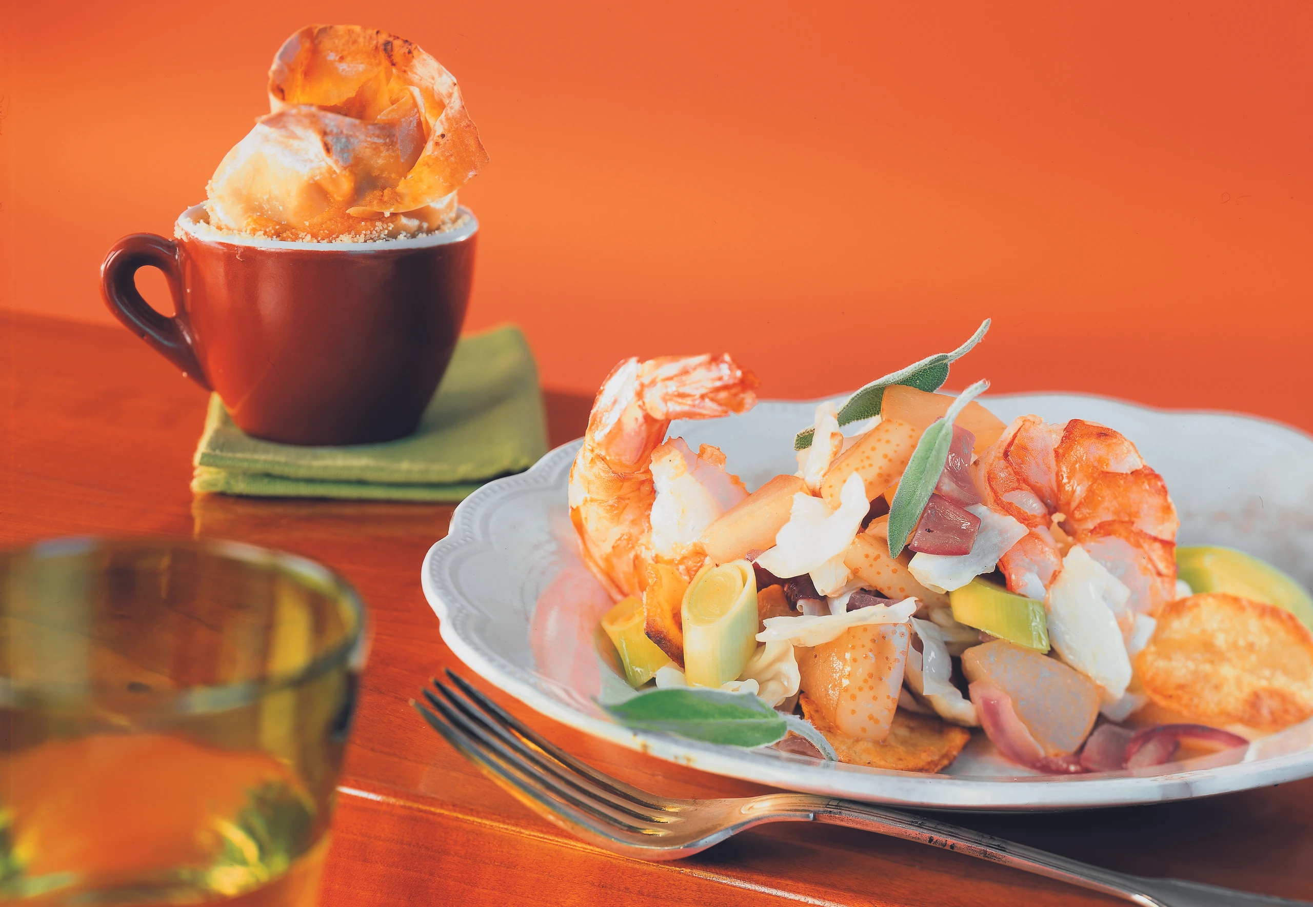 Knapp vor Ende der Garzeit Lauch, Salbei und Butter untermischen. Gemüse mit Salz und Pfeffer würzen. Garnelen behutsam untermischen, und kurz ziehen lassen. Gröstel rasch servieren.