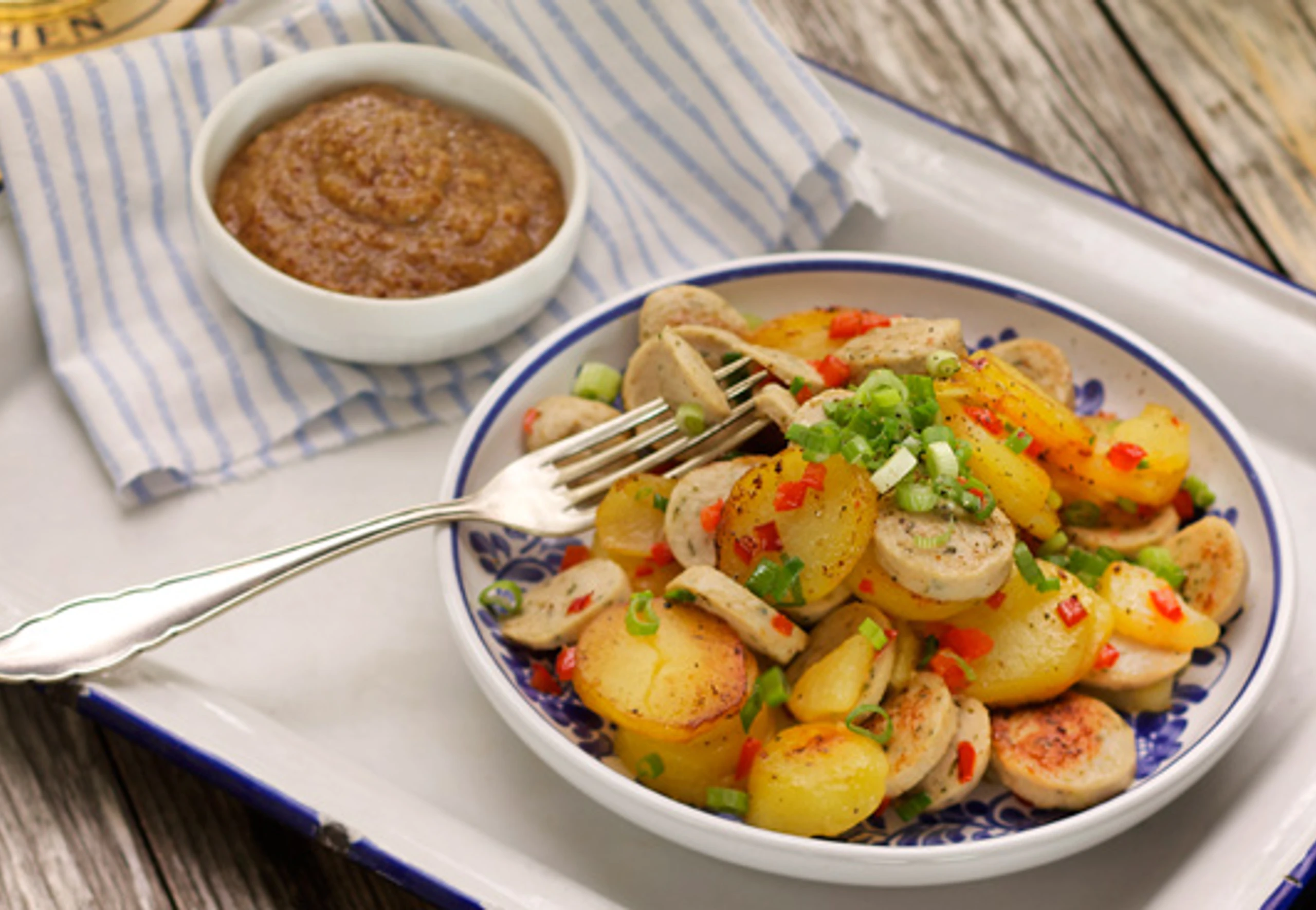 Weißwurst in heißem Wasser ca. 10 Minuten ziehen lassen, herausnehmen, auskühlen lassen, enthäuten und in Scheiben schneiden.