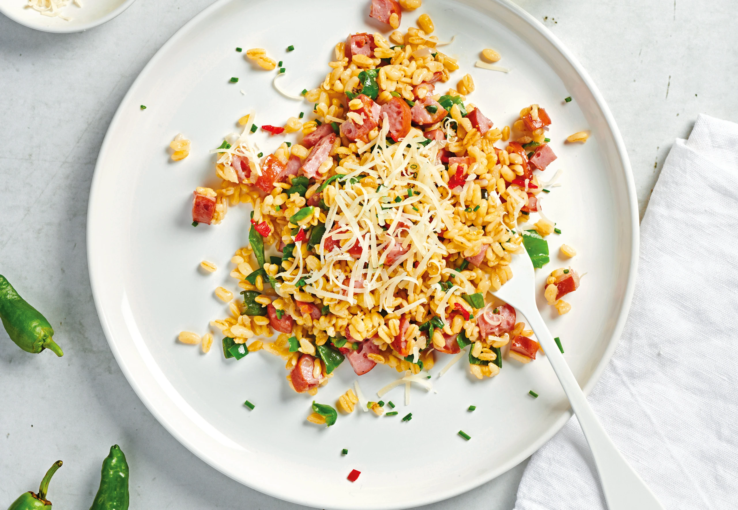 Weizenrisotto mit Käsekrainer und Pimentos