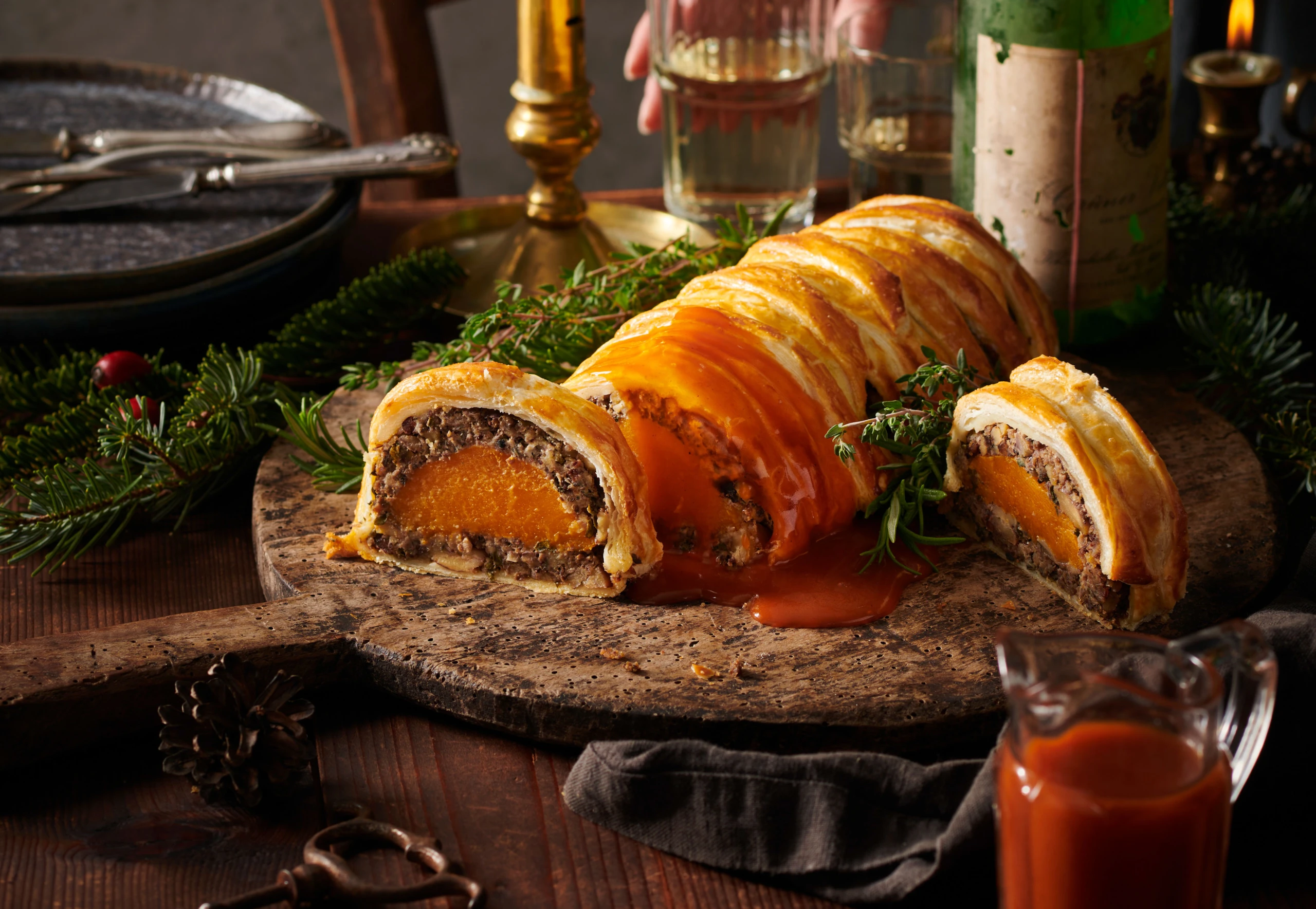Blätterteig aufrollen. Ein Drittel der Pilzmasse der Länge nach mittig auf dem Teig andrücken. Kürbishälften darauf legen, mit der übrigen Pilzmasse bedecken und gut andrücken. Blätterteig links und rechts in Streifen schneiden und abwechselnd über den Kürbis einschlagen. Dotter und Obers verquirlen, Teig damit bestreichen. Im Rohr (2. Schiene von unten) ca. 35 goldbraun backen.