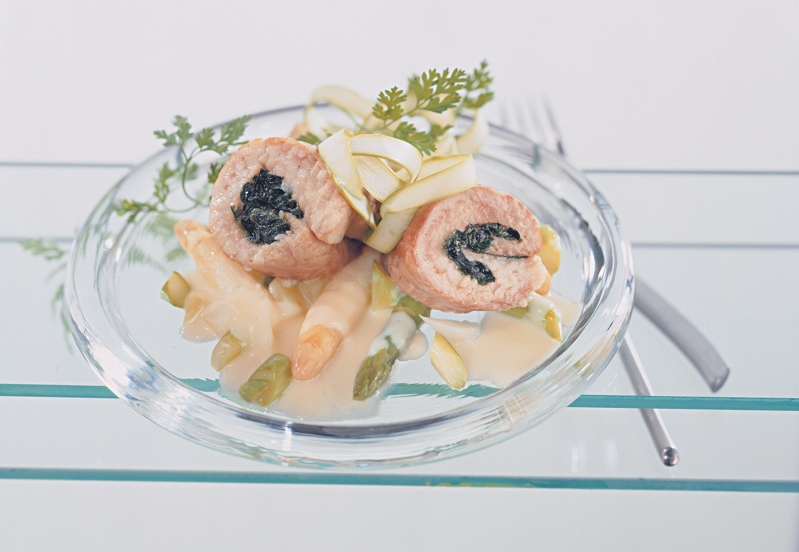 Pfanne ins Rohr (untere Schiene / Gitterrost) schieben, Rouladen ca. 10 Minuten garen, dabei öfters wenden. Rouladen aus der Folie wickeln, in Scheiben schneiden, mit Spargelragout und Kerbel servieren.