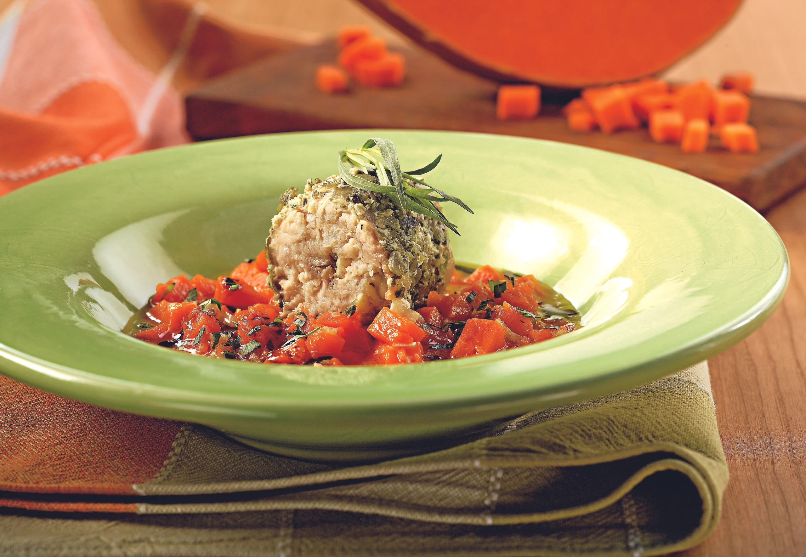 Kürbisgemüse mit dem entstandenen Saft anrichten, Fischfilets aus den Formen stürzen, auf dem Gemüse anrichten, mit Estragonblättchen garnieren.