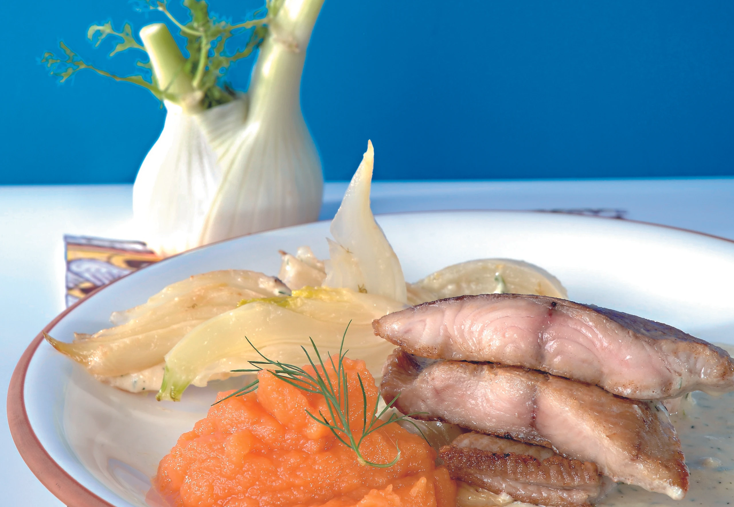 Filet in breite Streifen schneiden, mit Fenchel und Püree anrichten.