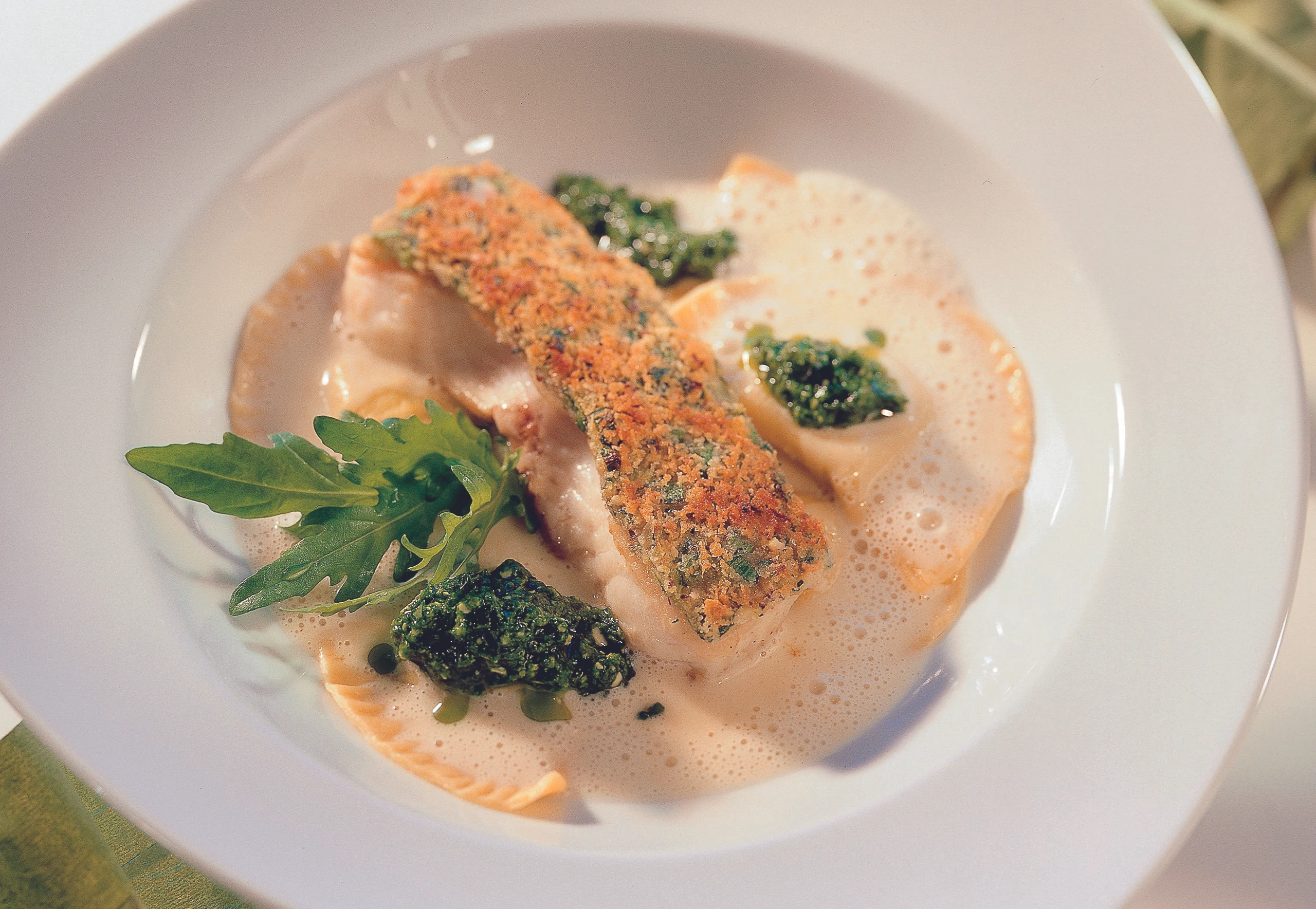 Wels mit Haselnusskruste auf Erdäpfeltascherln und Erdäpfelcreme