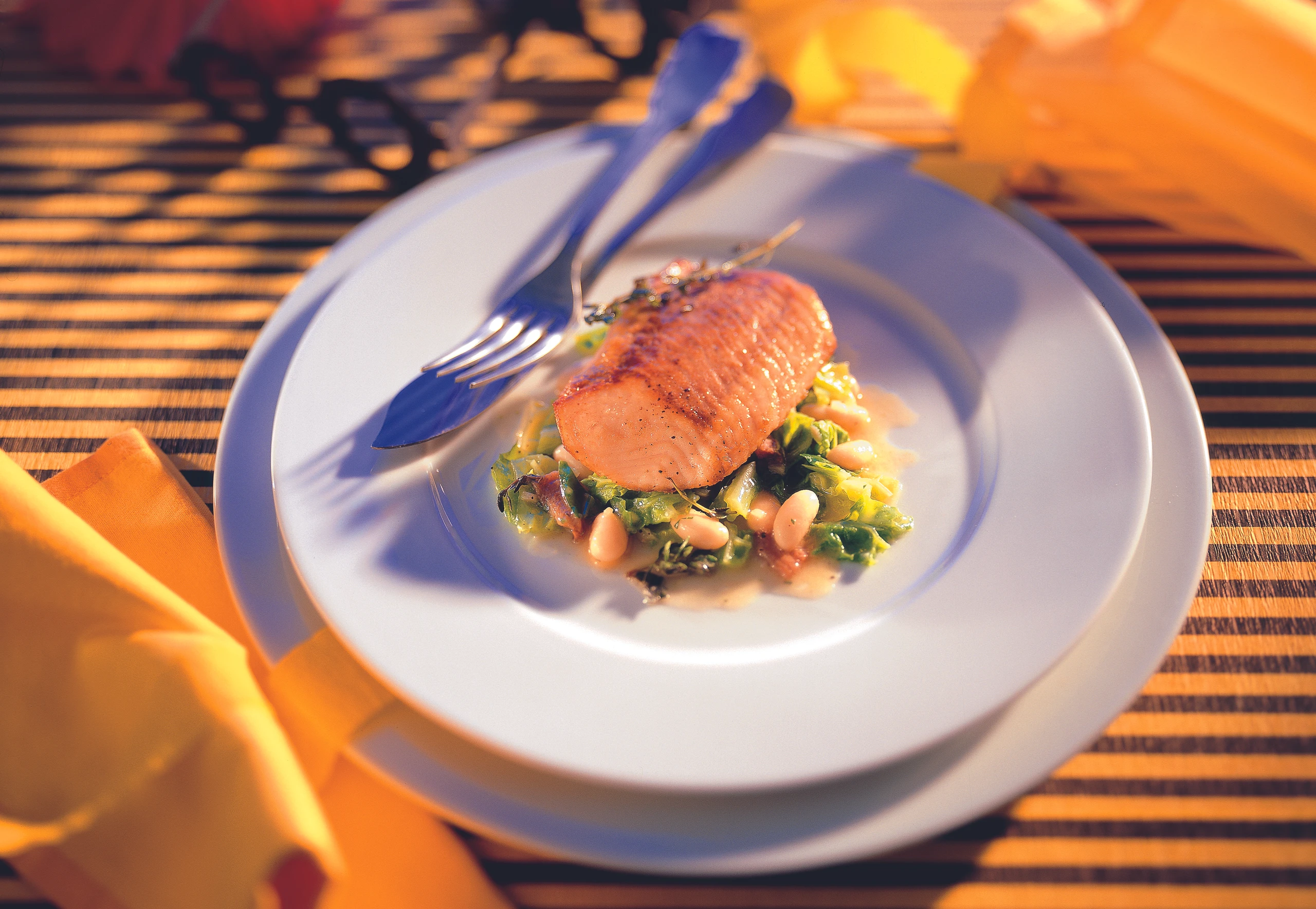 Knoblauch mit Sardellenfilets und Thymian im Olivenöl anbraten. Bohnen untermischen, Suppe zugießen und das Gemüse ca. 1 Minute köcheln. Gemüse zuerst mit Salz, Pfeffer und einigen Tropfen Zitronensaft würzen, dann durch Einrühren der kalten Butter binden. Fisch einlegen, kurz ziehen lassen und mit dem Gemüse anrichten.