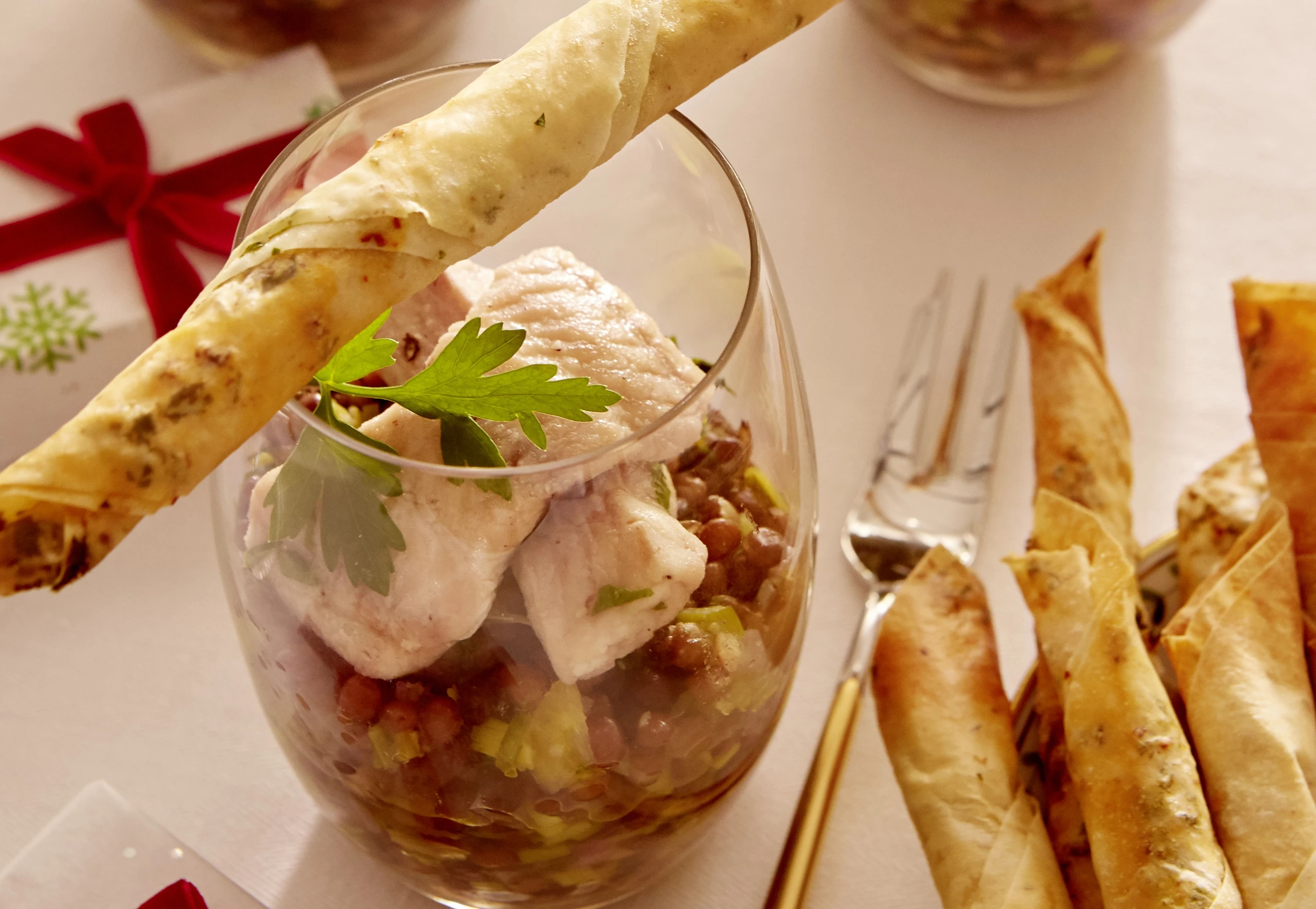 Welsfilet mit Linsen-Orangensalat und Chilistangerln