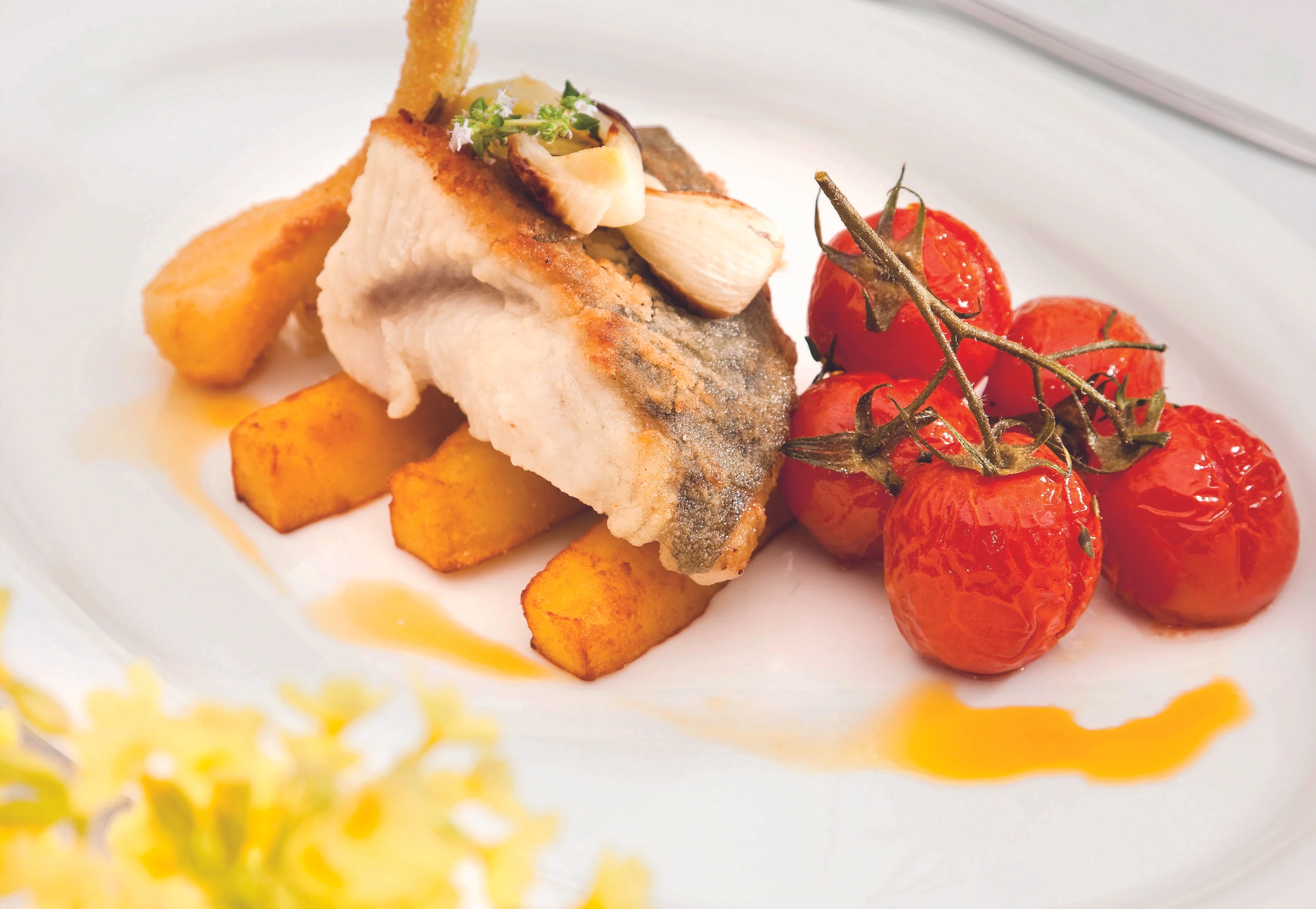 - Nach halber Garzeit übrige Jungzwiebeln zugeben und mitbraten. Filets mit Chiliöl beträufeln, mit Erdäpfeln, Jungzwiebeln und Paradeisern anrichten.