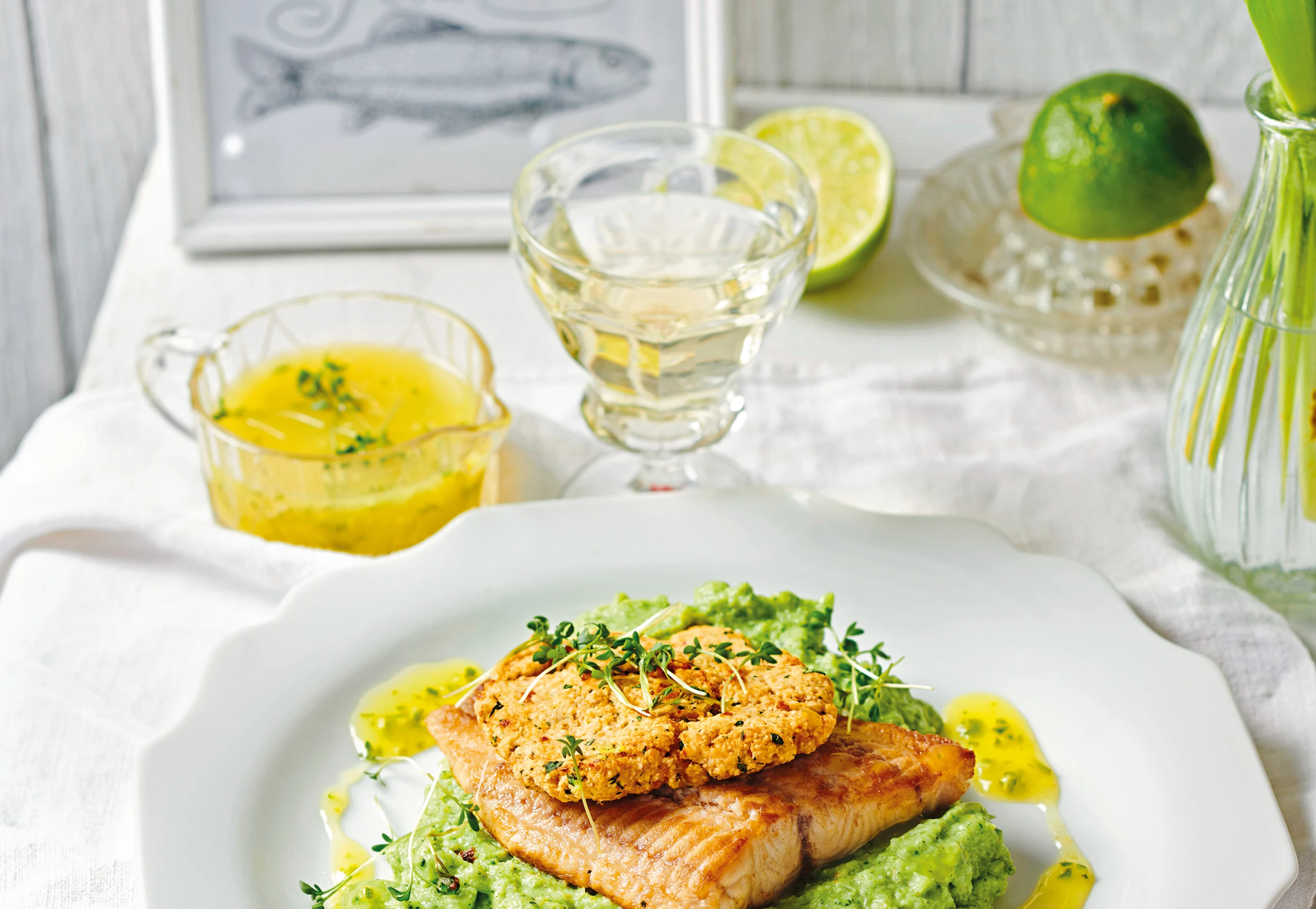 Welsfilet mit Räucherlachskruste und Brokkolipüree