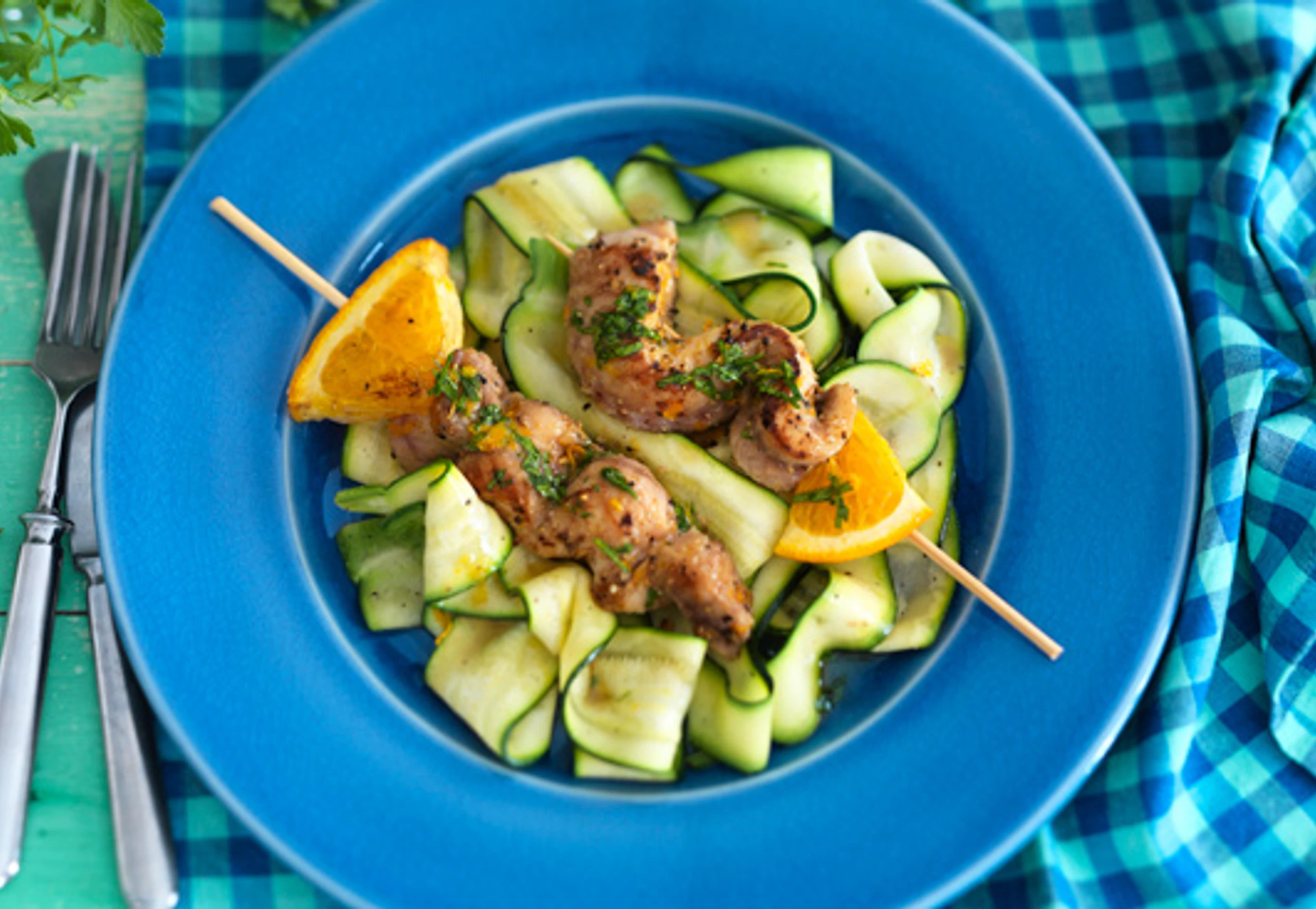 - Zucchini putzen und mit dem Sparschäler in Streifen schneiden. Öl in einer beschichteten Pfanne erhitzen, Zucchini darin unter Schwenken knackig braten (ca. 2 Minuten), mit Salz, Pfeffer und Zitronensaft würzen. Zucchinigemüse mit den Spießen anrichten.