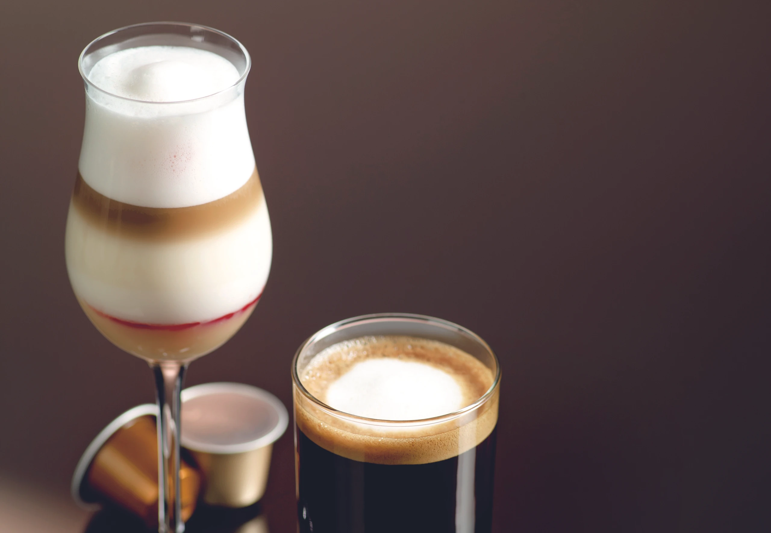Milch aufschäumen und die Gläser bis knapp unter den Rand damit füllen. Ristretti zubereiten und über einen Löffel vorsichtig in die Gläser laufen lassen.