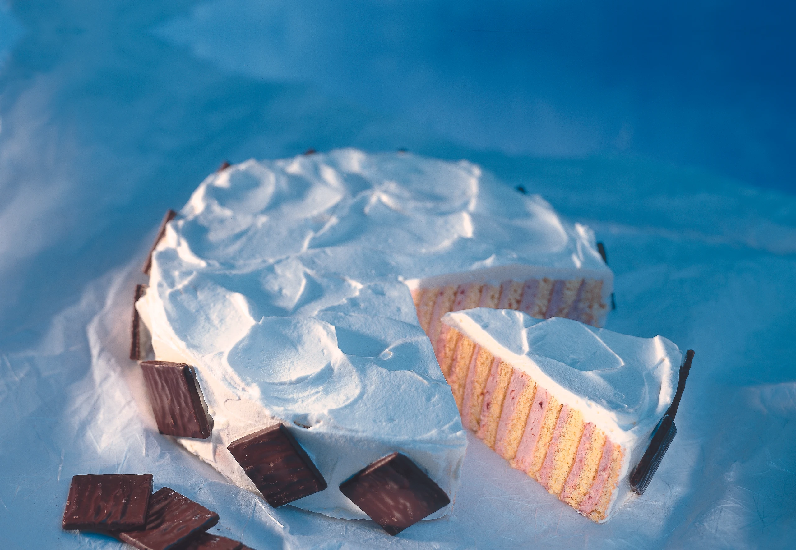 Boden einer Springform (Ø 26 cm) mit Klarsichtfolie belegen. Biskuitstücke der Länge nach in 5 cm breite Streifen schneiden. Einen Biskuitstreifen eng einrollen, in die Mitte des Bodens setzen, mit den übrigen Streifen spiralförmig umlegen. Tortenreifen darüber stellen und schließen. Torte mit Frischhaltefolie zudecken und ca. 2 Stunde kühlen.