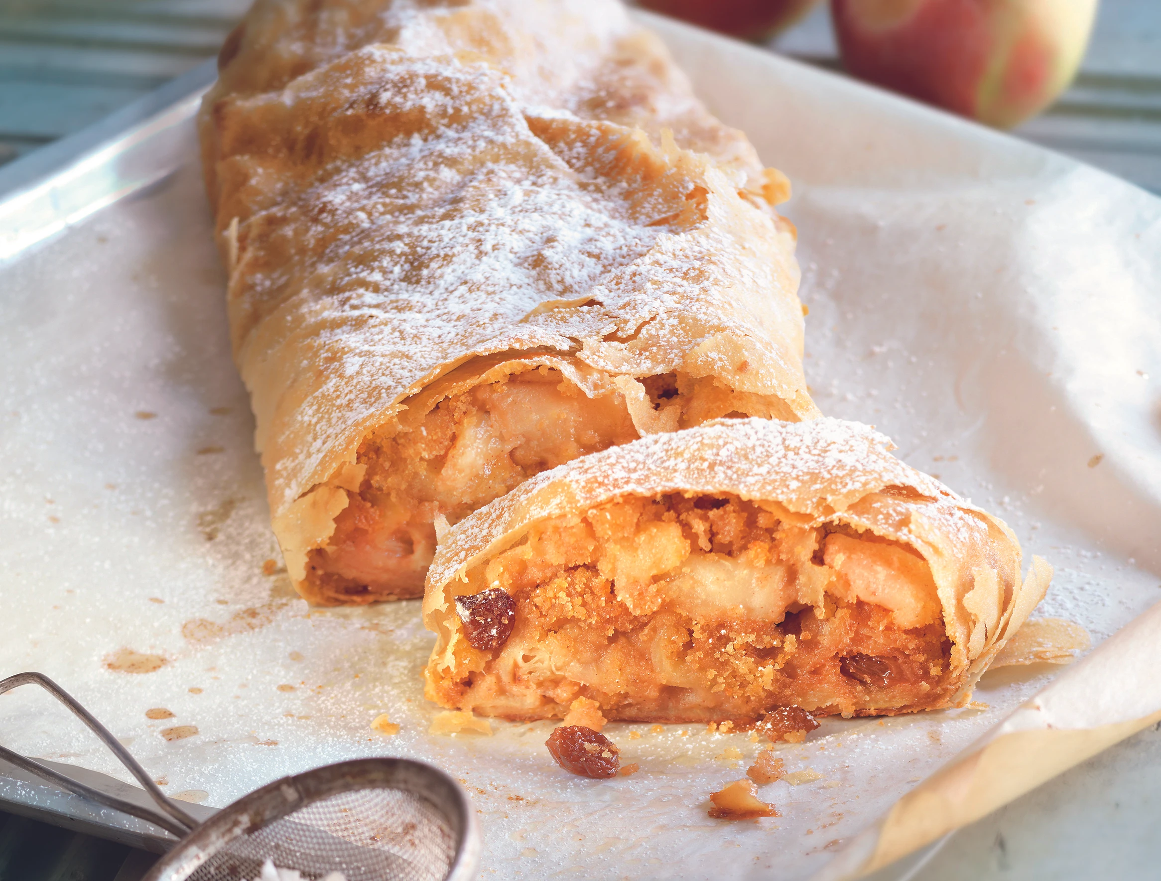Rohr auf 180°C vorheizen. Blackblech mit Backpapier belegen. Teig auf einem bemehlten Küchentuch ausrollen, dünn ausziehen (ca. 70 x 50 cm) und mit Butter beträufeln. Brösel und Äpfel auf zwei Dritteln des Teiges verteilen. Dicke Teigränder wegschneiden. Teig mit Hilfe des Tuches einrollen.
