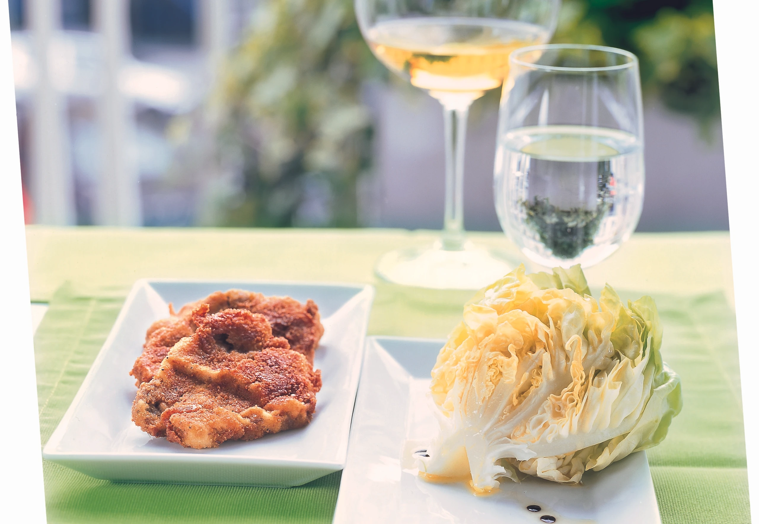 Butterschmalz erhitzen (halb so hoch wie die Schnitzel dick sind). Schnitzel darin beidseitig backen, Pfanne dabei immer wieder „rütteln“ (die Schnitzeloberfläche wird immer wieder von Backfett „überspült“). Schnitzel auf Küchenpapier abtropfen lassen und mit den Salatherzen servieren.
