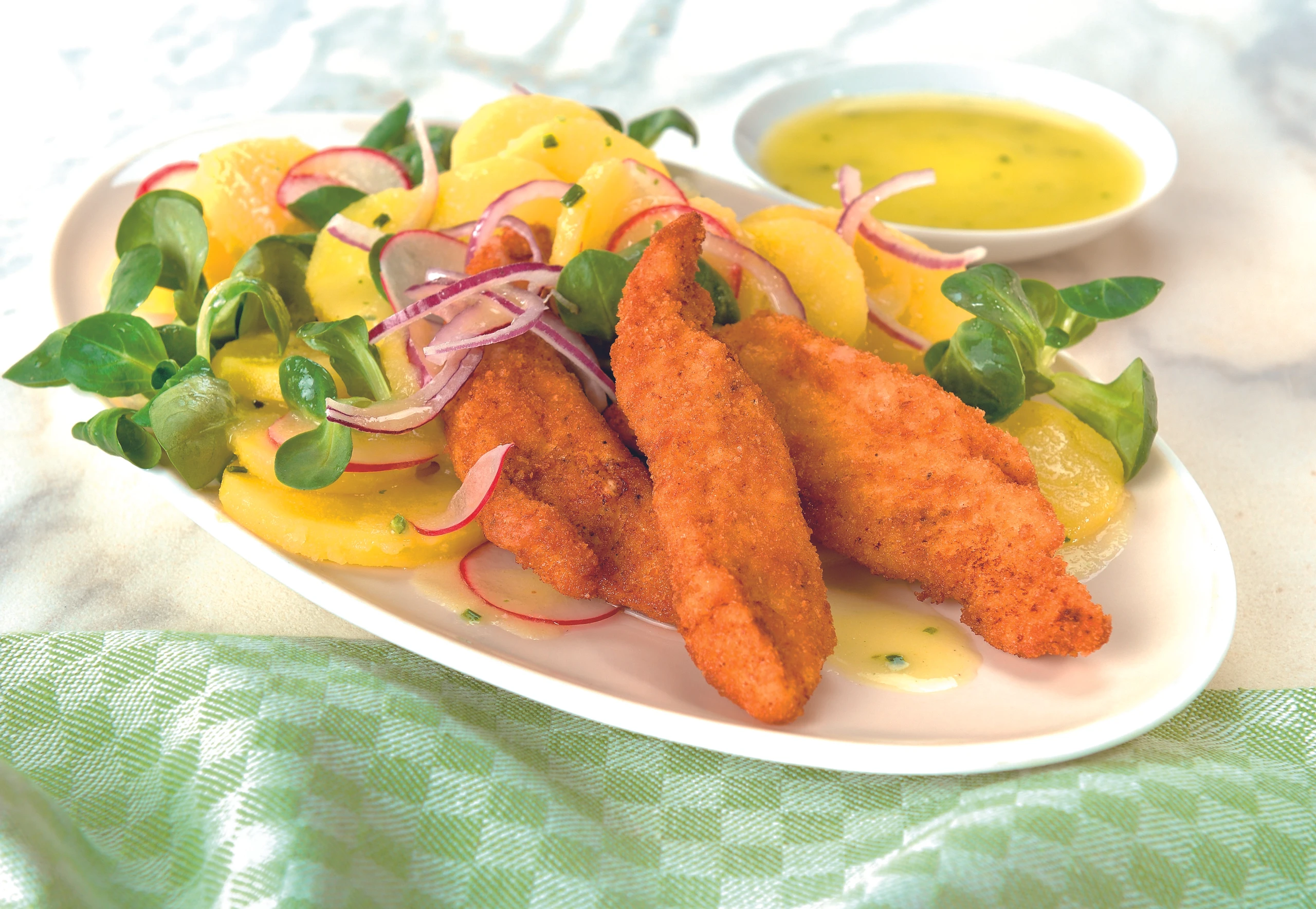 Hühnerfilets längs in ca. 2 cm breite Streifen schneiden, mit Salz und Pfeffer würzen. Filets in Mehl wälzen, durch die verquirlten Eier ziehen und in den Bröseln panieren.
