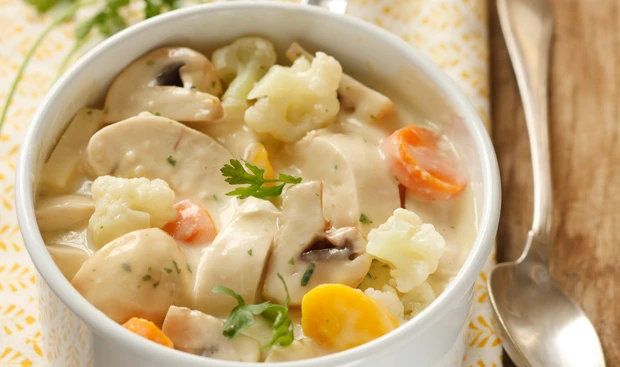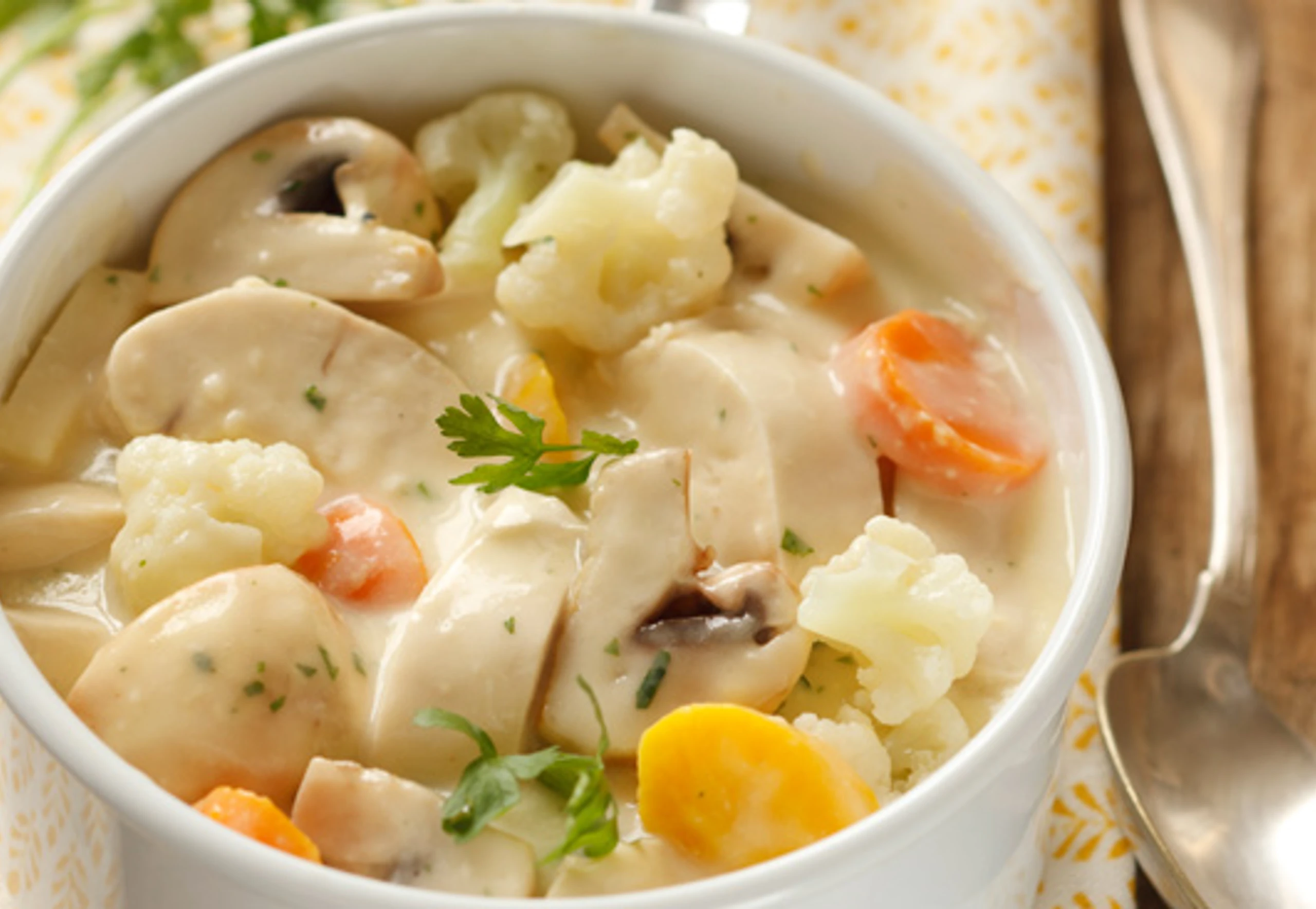 Sauce mit Salz, Pfeffer und Muskat würzen. Fleisch, Gemüse, Champignons und Petersilie untermischen. Einmachhuhn erwärmen und anrichten. Als Beilage passen Bröselknödel.
