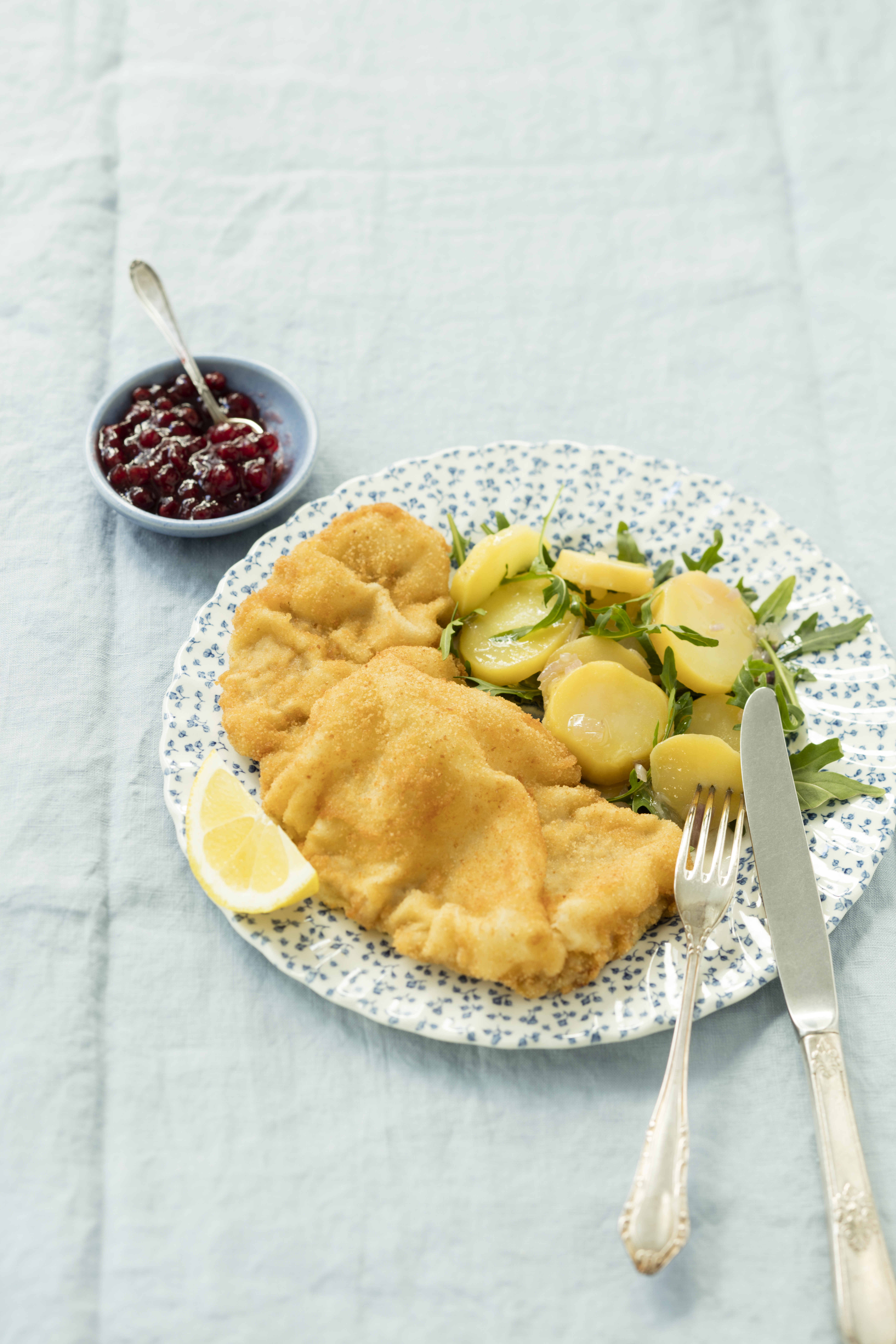 - Schnitzel herausheben und auf Küchenpapier abtropfen lassen. Schnitzel mit Salat anrichten und mit Zitronenspalten garniert servieren. Dazu passt Preiselbeerkompott.