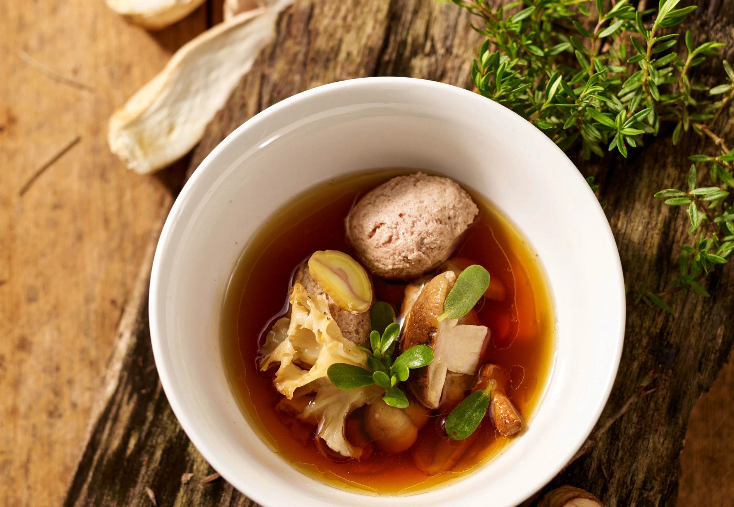 Steinpilze putzen, in Scheiben schneiden und kurz in aufgeschäumter Butter schwenken. Suppe durch ein mit einem Tuch ausgelegtes Sieb gießen, mit Salz und Weinbrand abschmecken. Suppe mit Rehnockerln und Steinpilzen anrichten, mit Portulak garnieren