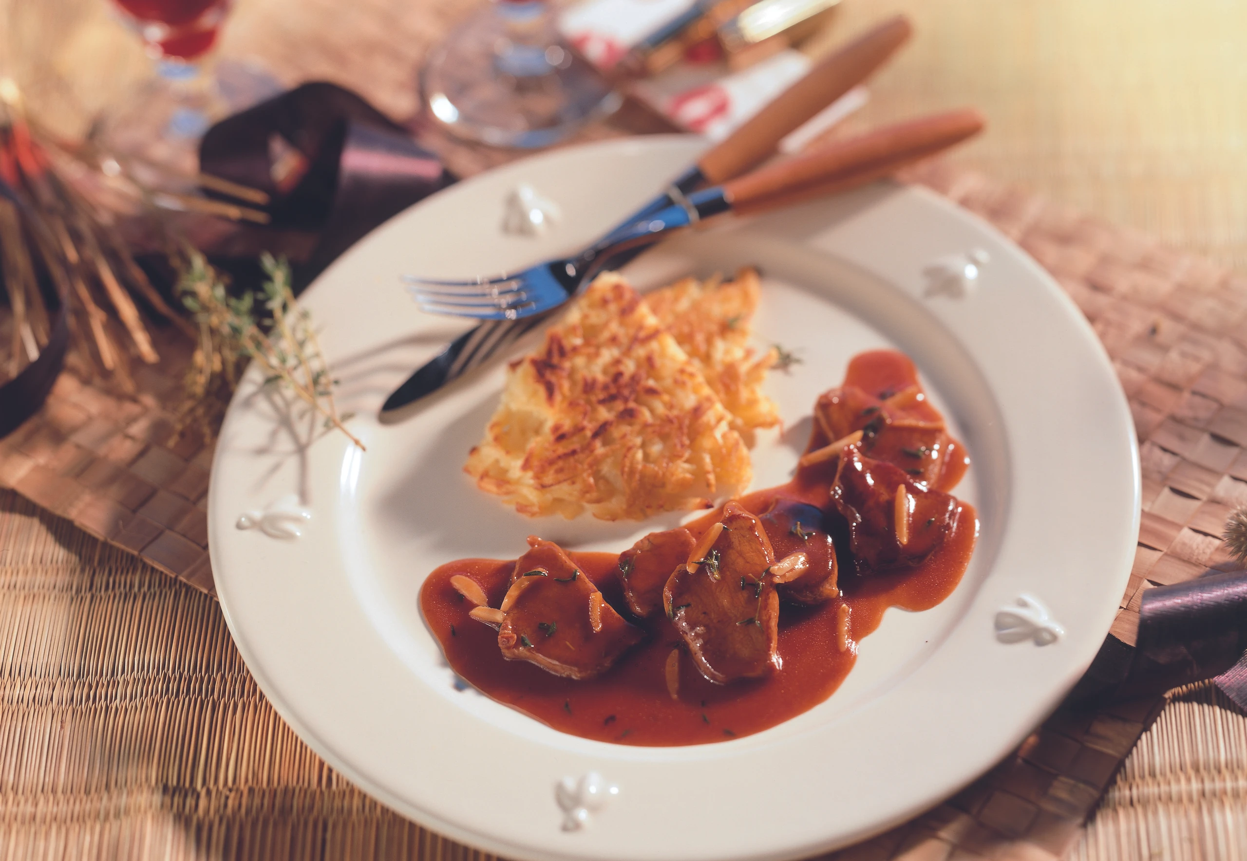 Wildgeschnetzeltes mit Mandeln und Hagebuttensauce auf Erdäpfelrösti