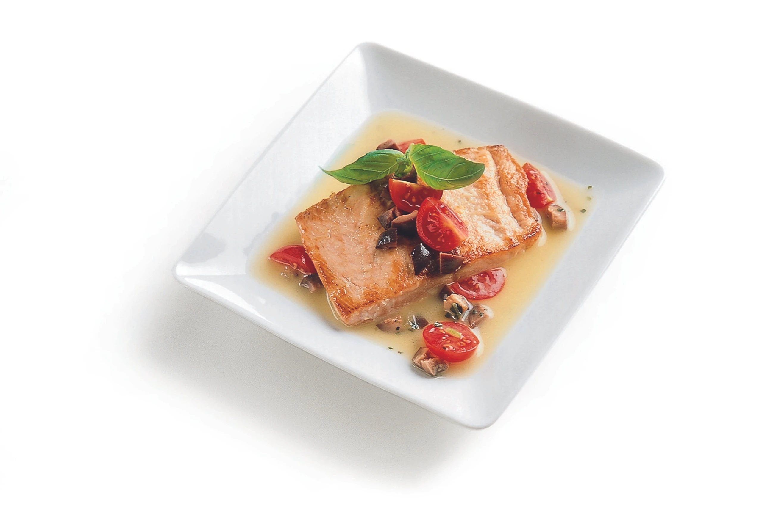 Bratfett abgießen, Oliven und Paradeiser im Bratrückstand anschwitzen, mit Suppe ablöschen und aufkochen. Fond durch Einrühren der kalten Butter binden, Basilikum einrühren. Filets mit dem Fond anrichten.