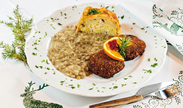 - Für die Sauce Zwiebel schälen, fein schneiden und in 2 EL Öl goldbraun rösten. Zwiebel mit 1 EL Mehl stauben und mit Suppe aufgießen. Sauce verrühren, 1 Lorbeerblatt zugeben und aufkochen. Linsen untermischen, kurz mitköcheln und mit Salz, Pfeffer und Thymian würzen.