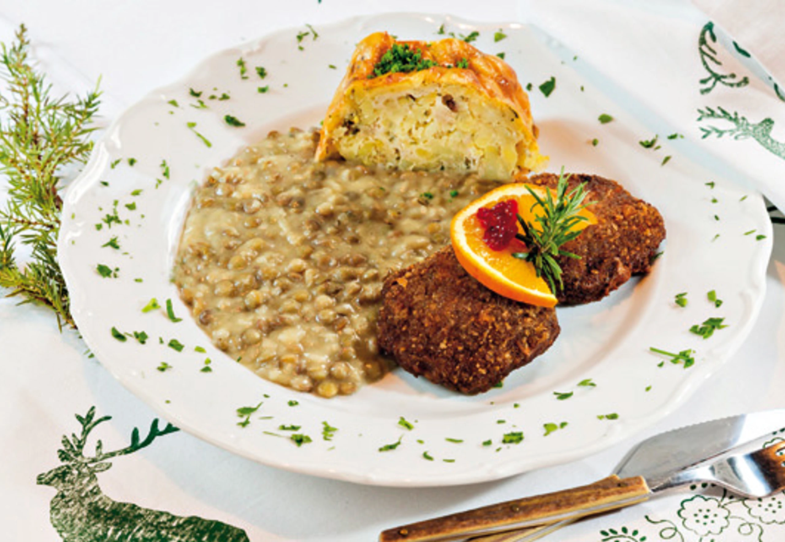 - Teigblätter mit Ei bestreichen, übereinander legen und die Erdäpfelmasse darauf verteilen. Teig einrollen, auf das Blech setzen, mit Ei bestreichen und im Rohr (mittlere Schiene) ca. 35 Minuten backen. Gegen Ende der Garzeit Wildlaibchen in Öl beidseitig braten. Laibchen mit Sauce und Strudel anrichten. Eventuell mit Orangenscheiben, Preiselbeeren und Rosmarin garnieren.