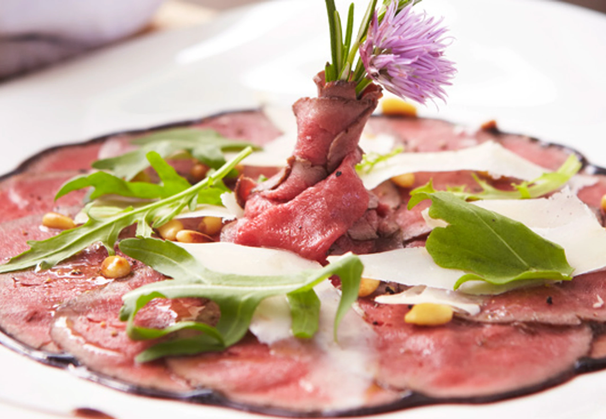 - Ca. 15 Minuten vor dem Anrichten. Fleisch aus der Folie wickeln, mit der Wurst- oder Brotschneidemaschine in dünne Scheiben schneiden und überlappend auf Tellern anrichten. Fleisch mit Kräuteröl beträufeln und mit Salzflocken, Parmesan, Pignoli und Rucola garniert servieren. Carpaccio eventuell zusätzlich mit Rosmarin und Schnittlauchblüten garnieren.