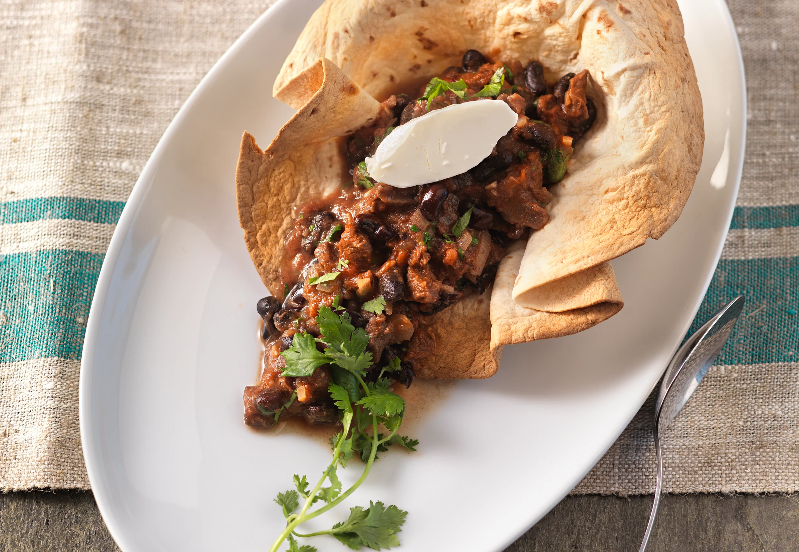 - Tortillas herausnehmen und auf Teller legen. Chili mit Koriander verfeinern, in den Tortillaschüsserln anrichten und mit Sauerrahm garniert servieren.