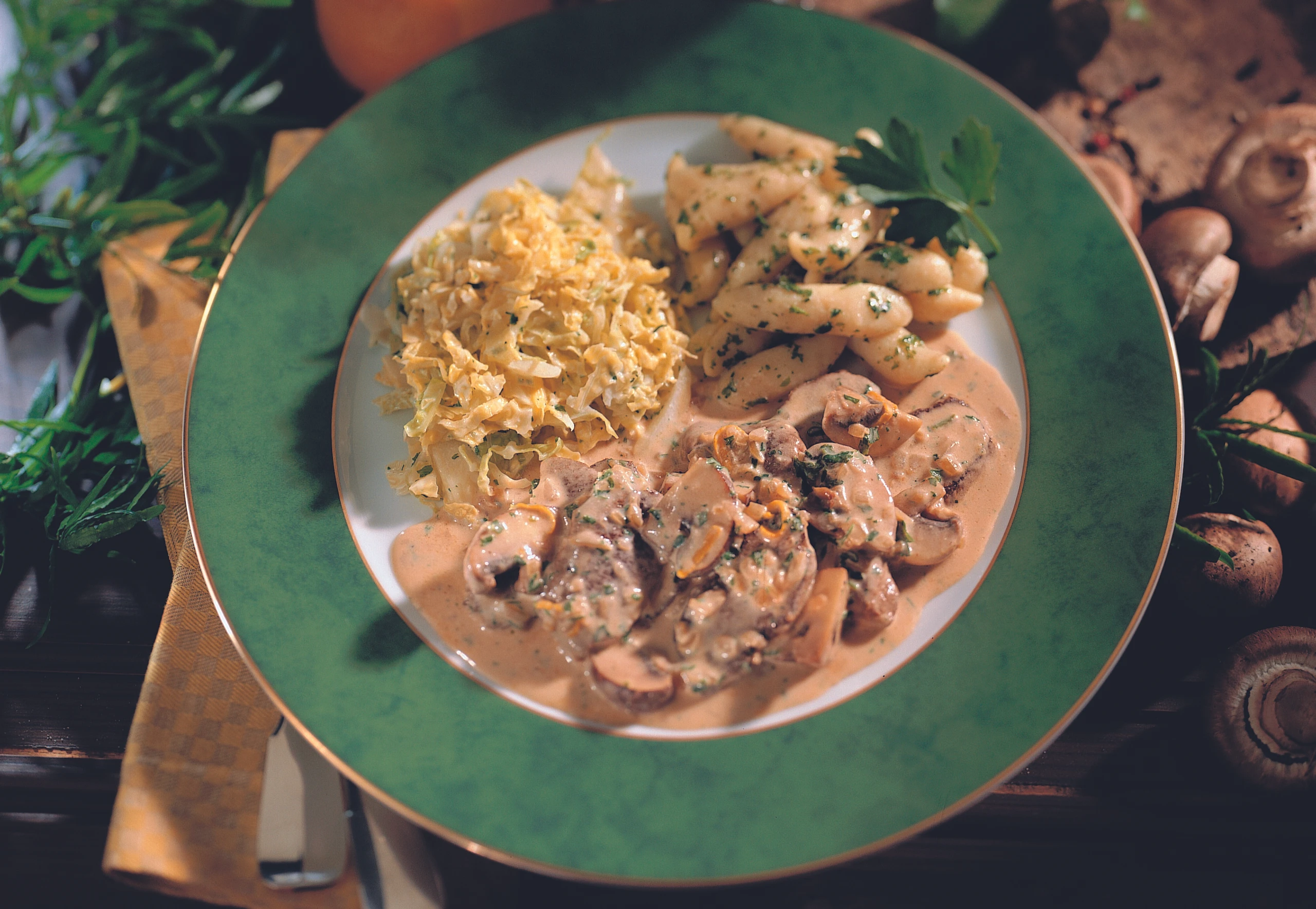 - Im Bratrückstand die Butter erhitzen. Zwiebel, Knoblauch und Schwammerln darin anschwitzen, Bratensaft zugießen und aufkochen. Crème fraîche einrühren und die Sauce cremig einkochen, mit Salz und Pfeffer würzen.