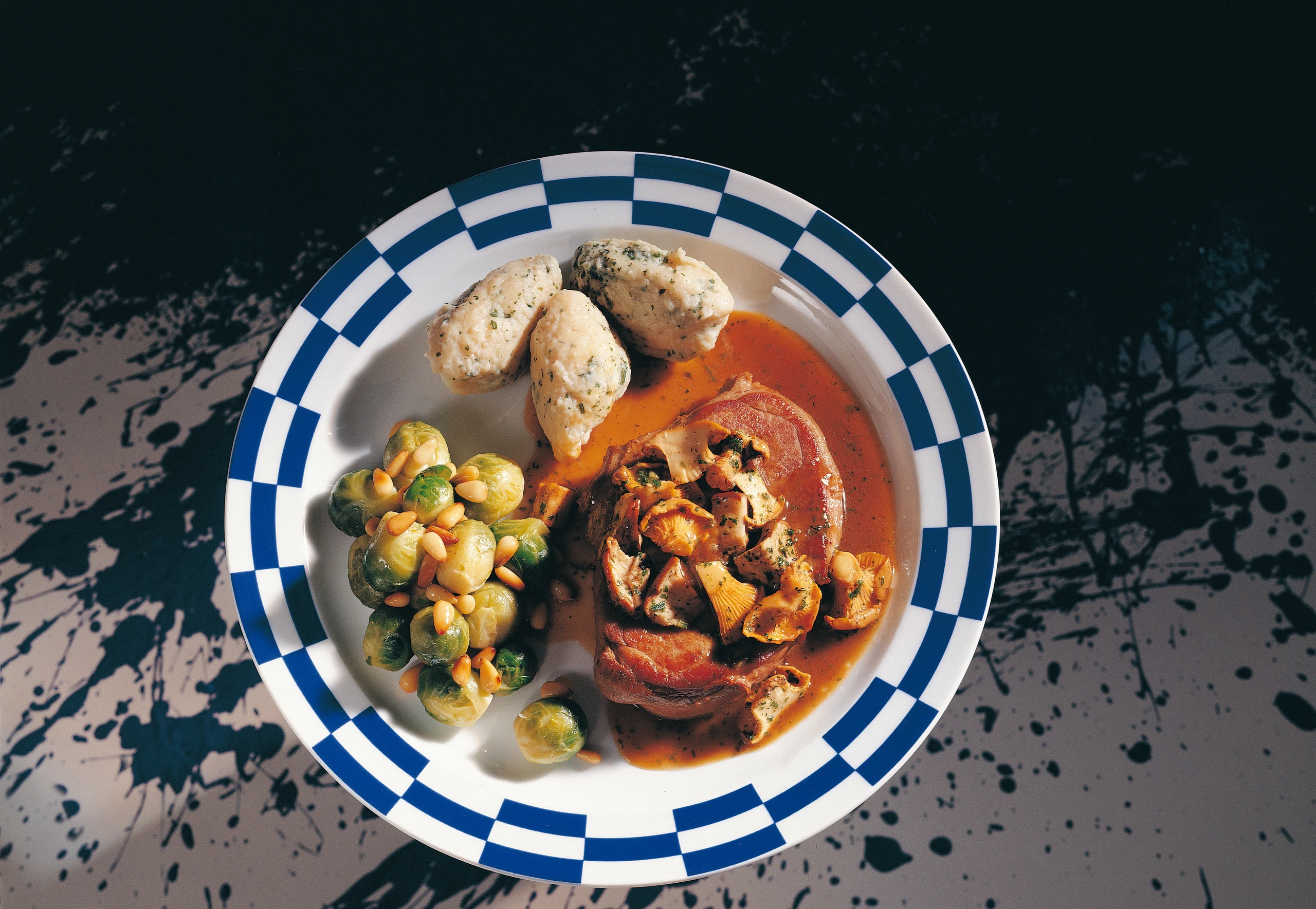 Wildschwein-Steaks mit Kohlsprossen mit Pignoli und Kräuternockerln