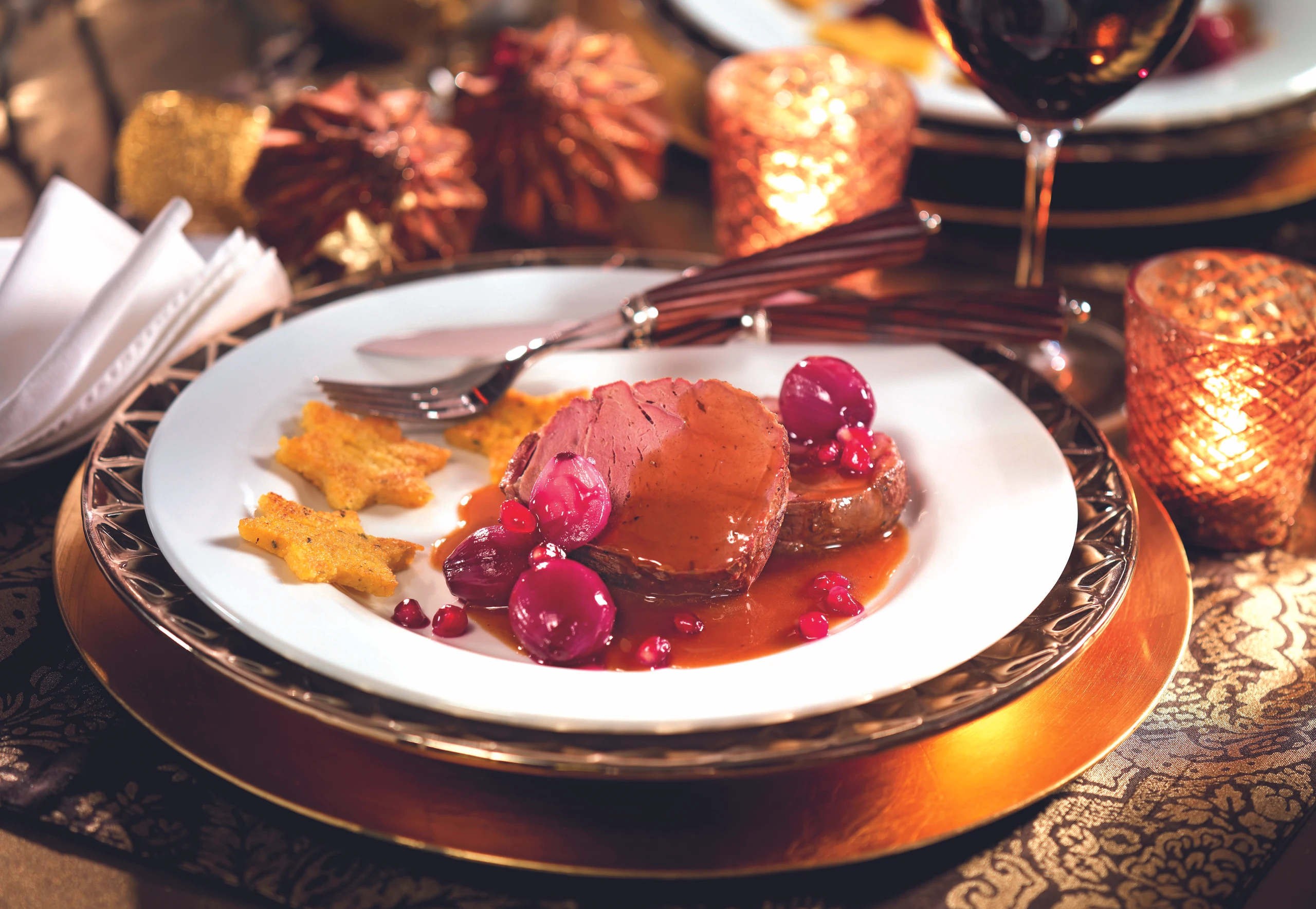 Wildschweinbraten mit Grenadine-Schalotten und Polentasternen