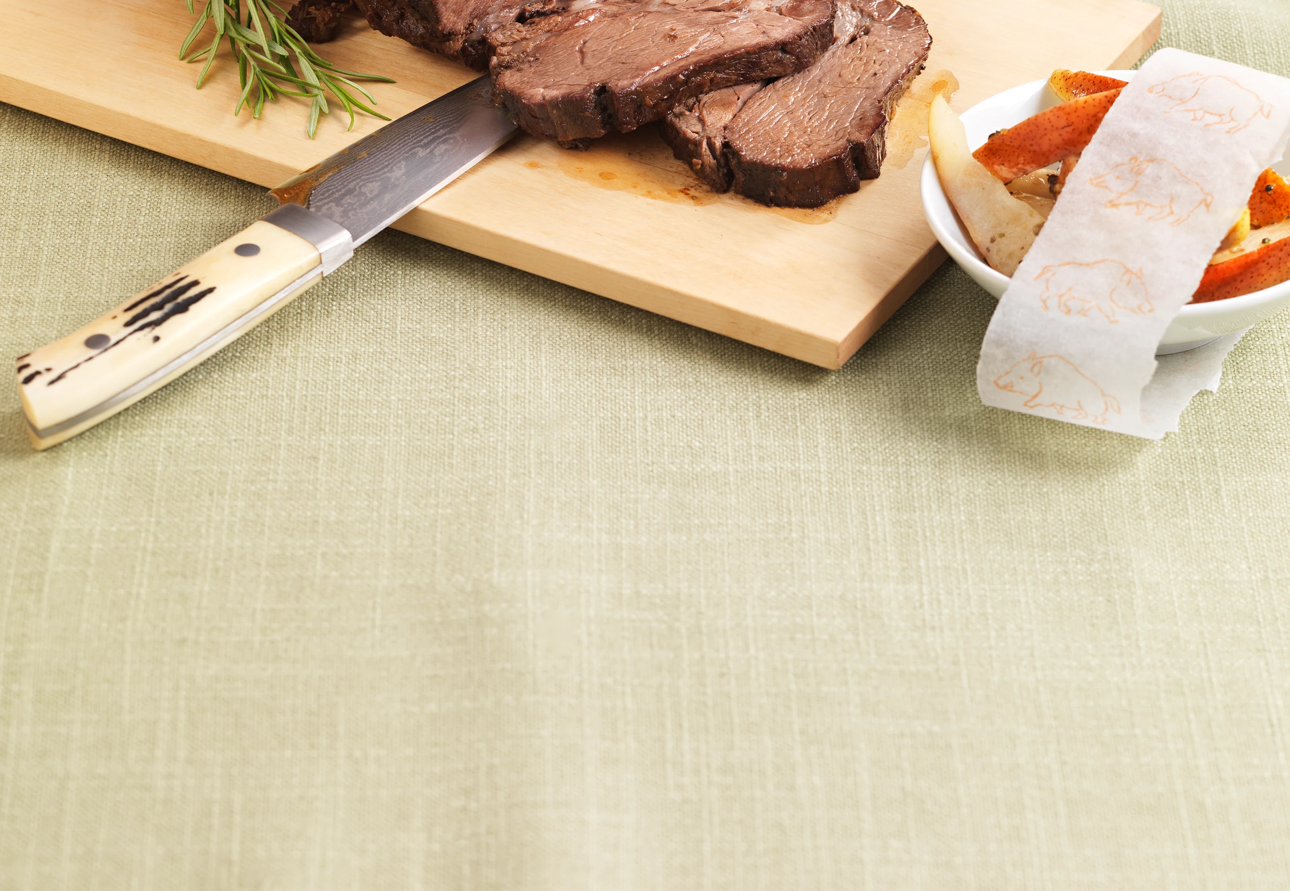 - Fleisch aus dem Rohr nehmen, Bratensaft abseihen und abschmecken. Fleisch portionieren, mit den Beilagen servieren, Bratensaft dazu reichen.