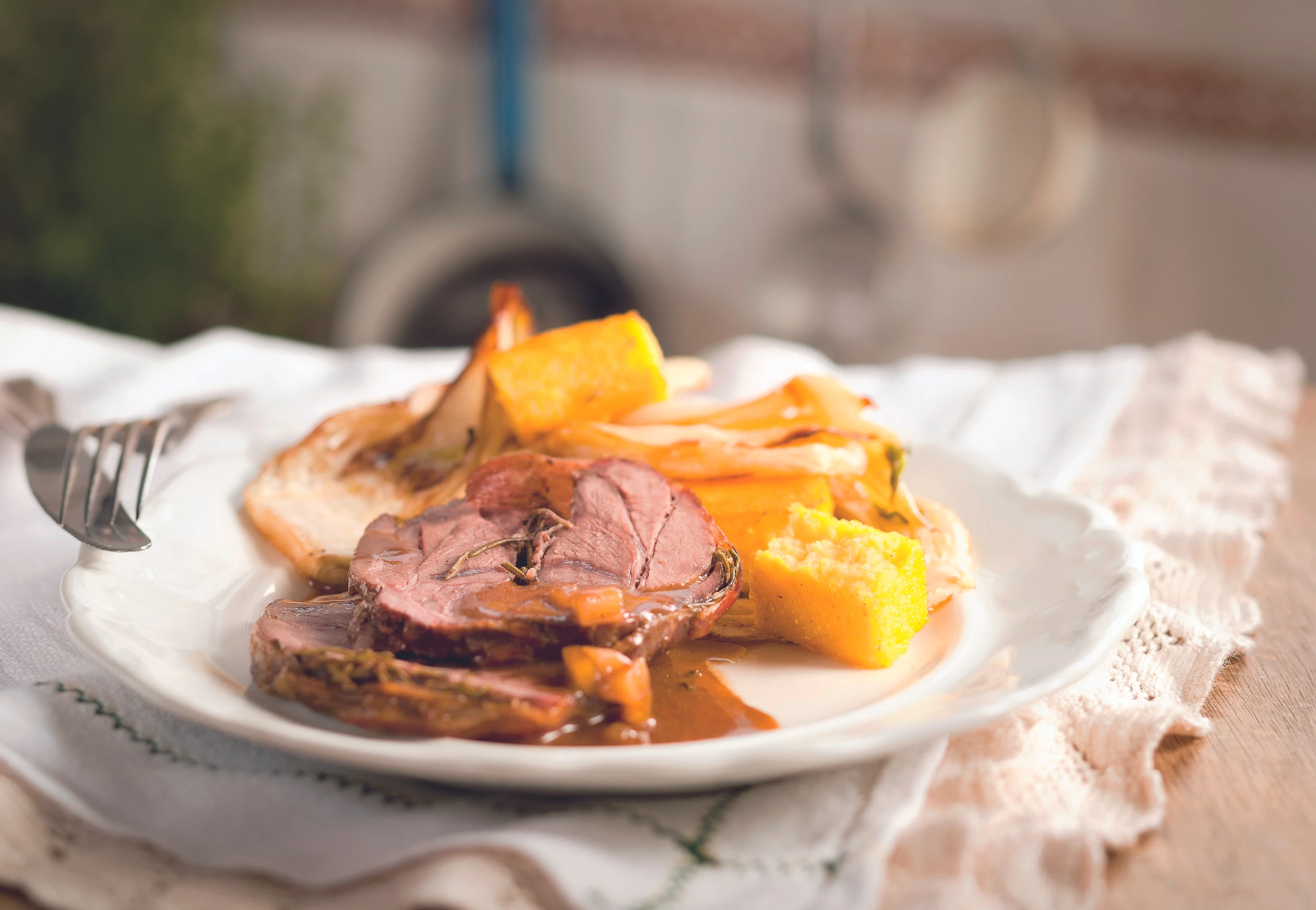 Wildschweinbraten mit Fenchel, Zwiebeln und Polenta servieren.