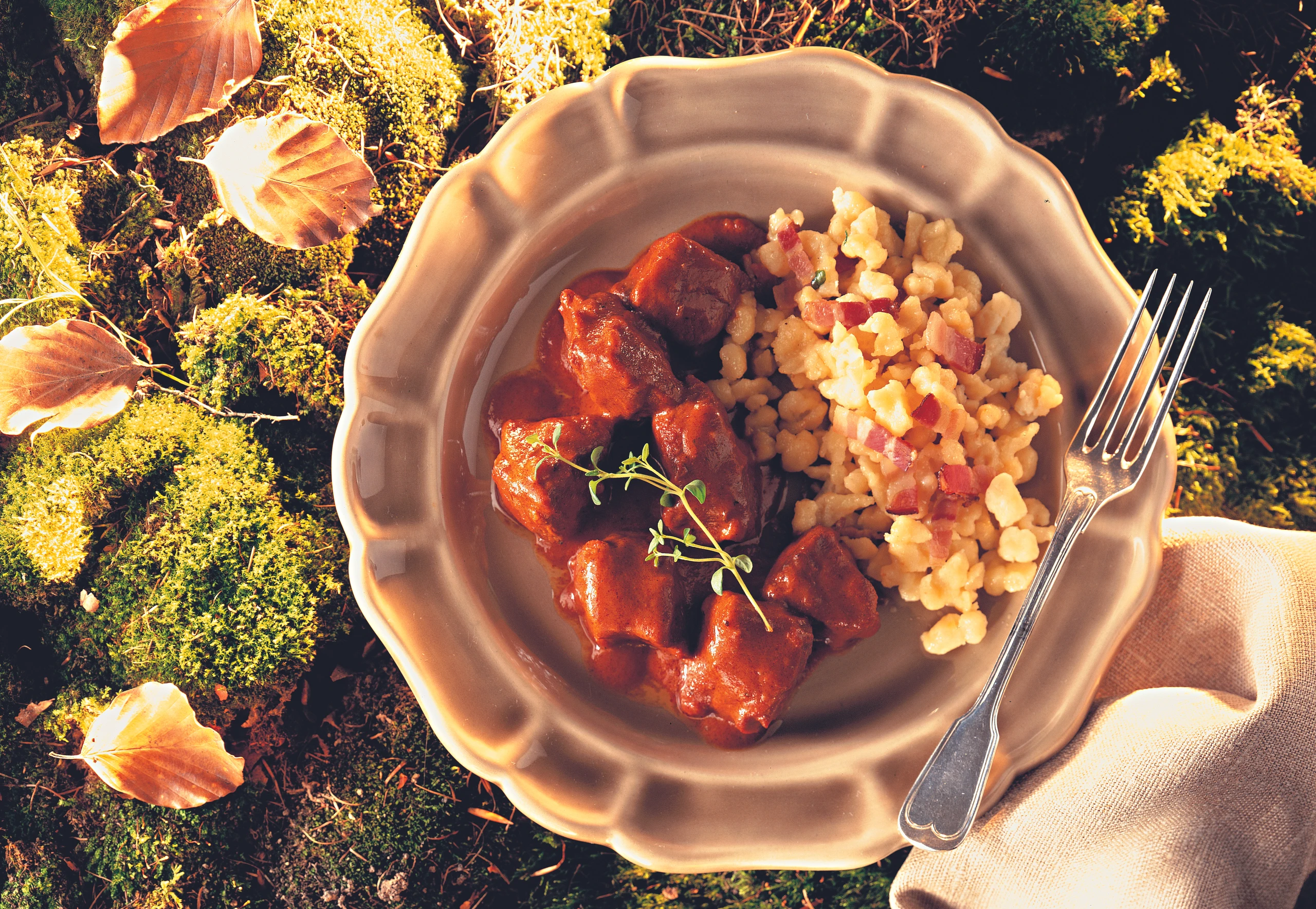 - Topf bis auf einen Spalt zudecken, Gulasch bei schwacher Hitze weich dünsten (dauert ca. 11/4 Stunden).