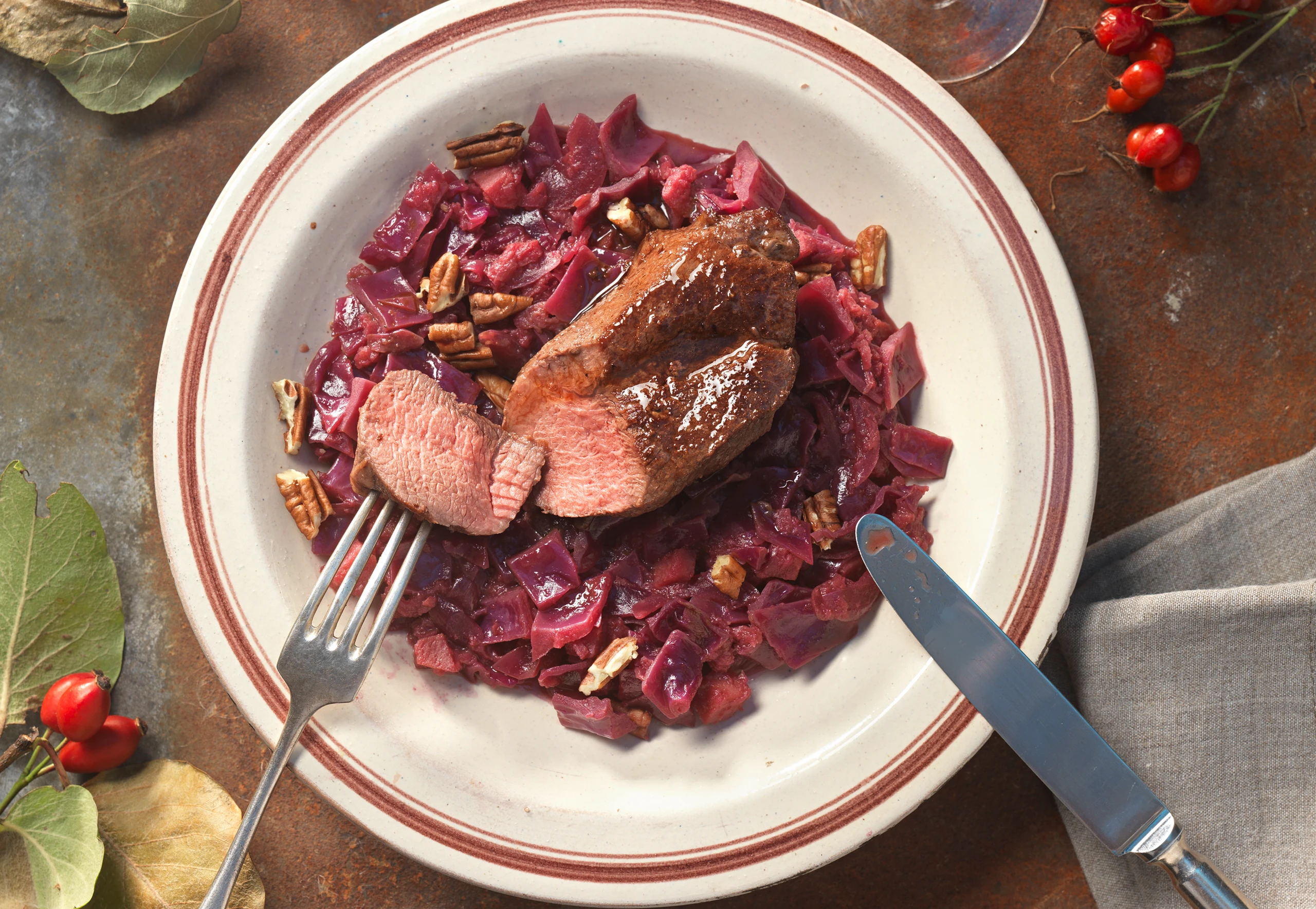 - Fleisch in ca. 4 cm dicke Medaillons schneiden, salzen, pfeffern und in heißem Butterschmalz ca. 4 Minuten braten, dabei immer wieder wenden. Fleisch auf einen Gitterrost legen und im Rohr (mittlere Schiene, Teller unterstellen) rosa ziehen lassen (ca. 10 Minuten). Wacholderbeeren mit dem Messerblatt andrücken, im Bratrückstand kurz rösten. Ausgetretenen Fleischsaft in die Pfanne geben, Butter einrühren. Steaks im Saft wenden. Mit dem Rotkraut servieren.