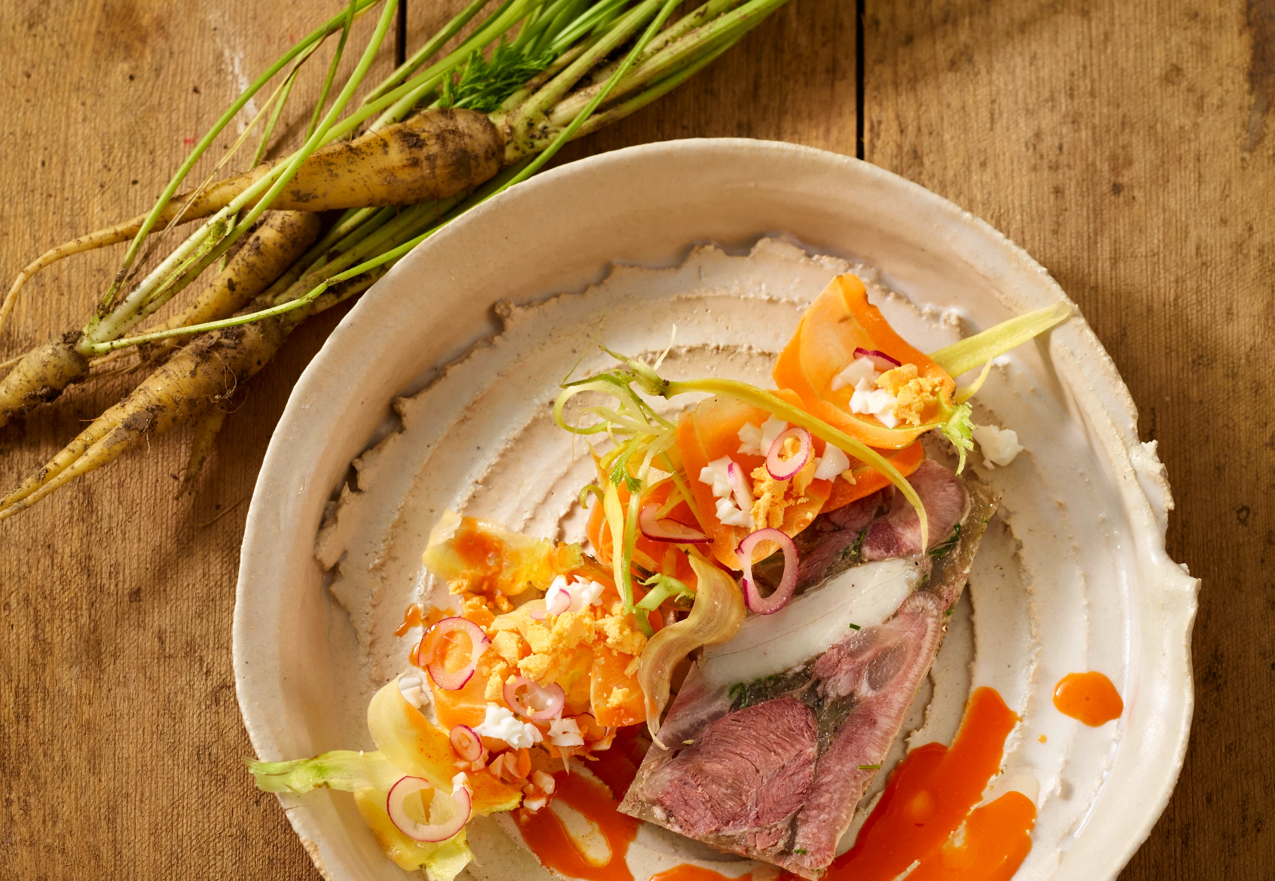 Sulz aus der Form stürzen, in Scheiben schneiden, mit gehackten Eiern, Schalottenringen und marinierten Karotten garnieren, mit übriger Vinaigrette beträufeln.
