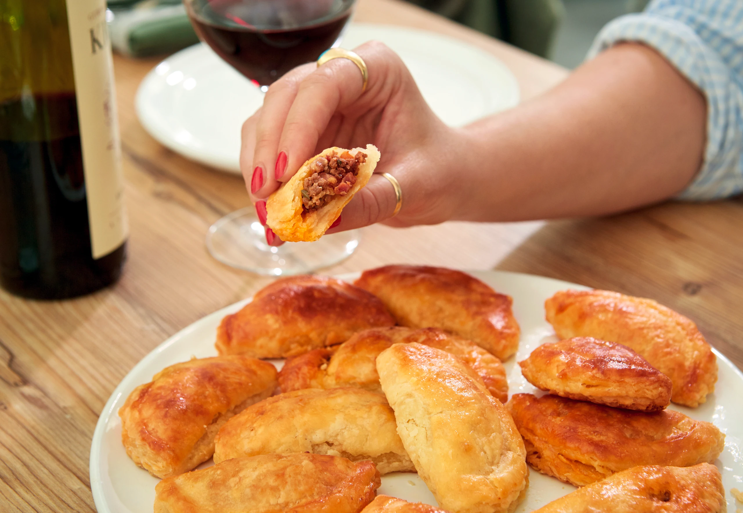 Rohr auf 180°C vorheizen. Backblech mit Backpapier belegen. Teig auf einer bemehlten Arbeitsfläche ausrollen und 12 Scheiben (Ø 8 cm) ausstechen.
