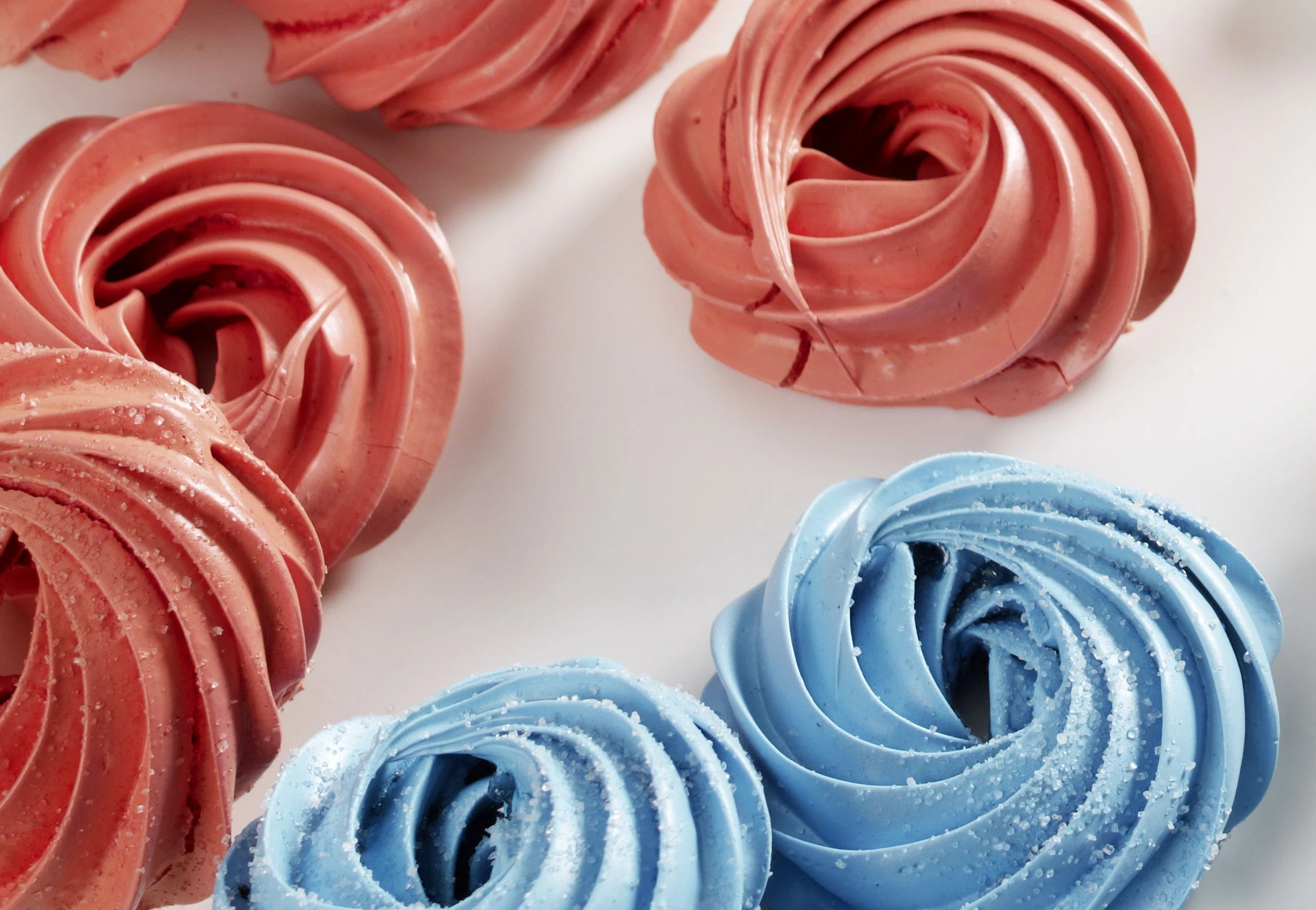 Farben jeweils mit einigen Tropfen Wasser verrühren. Schneemasse halbieren, einen Teil rot, den anderen blau färben. Jede Masse in einen Dressiersack mit Sterntülle (Ø 20 mm) füllen und Ringe (Ø 5 cm) auf die Bleche dressieren. Ringe mit Zucker bestreuen und im Rohr ca. 1 Stunde trocknen lassen; dabei einen Kochlöffel in die Backrohrtür klemmen, damit das Rohr einen kleinen Spalt offen bleibt.