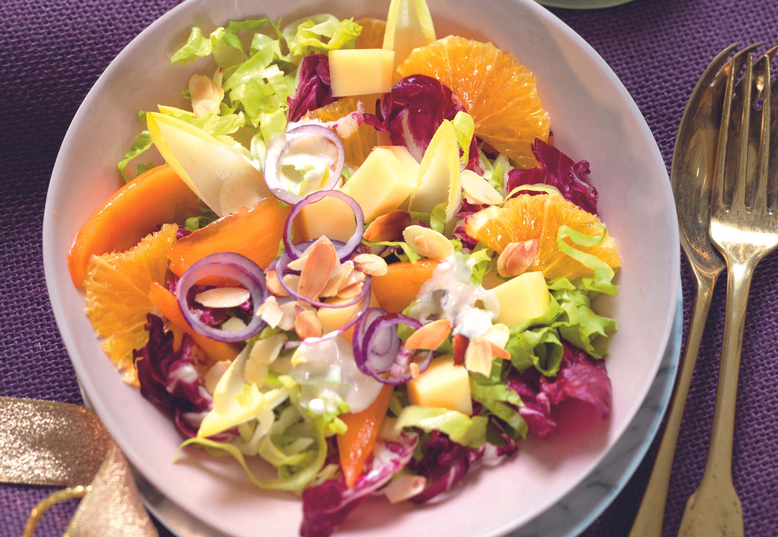 Orange mit einem scharfen Messer so schälen, dass auch die weiße Innenhaut entfernt wird. Orange in kleine Stücke schneiden. Sharonfrucht schälen, in kleine Stücke schneiden. Zwiebel schälen und in feine Ringe, Käse würfelig schneiden.