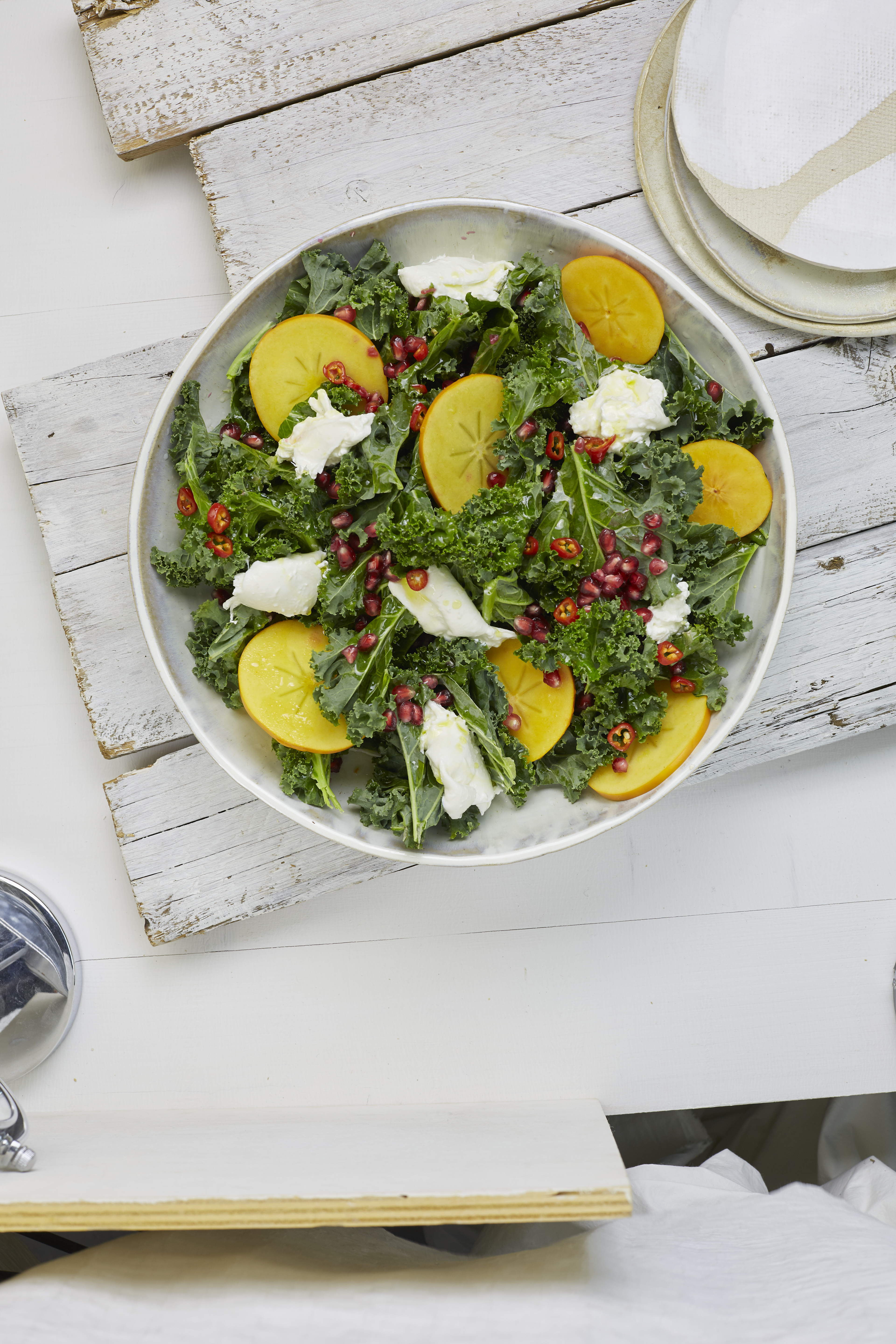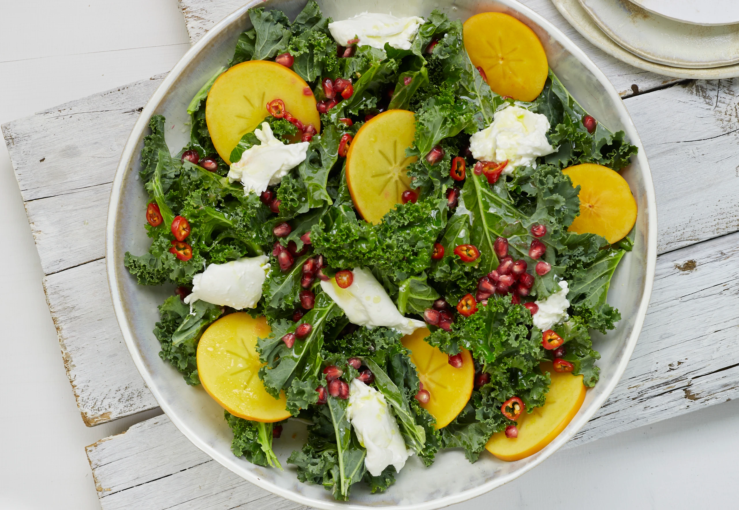 Kaki in dünne Scheiben schneiden. Burrata zerpflücken. Kakischeiben und Burrata auf Grünkohl anrichten. Granatapfelkerne darüber streuen.