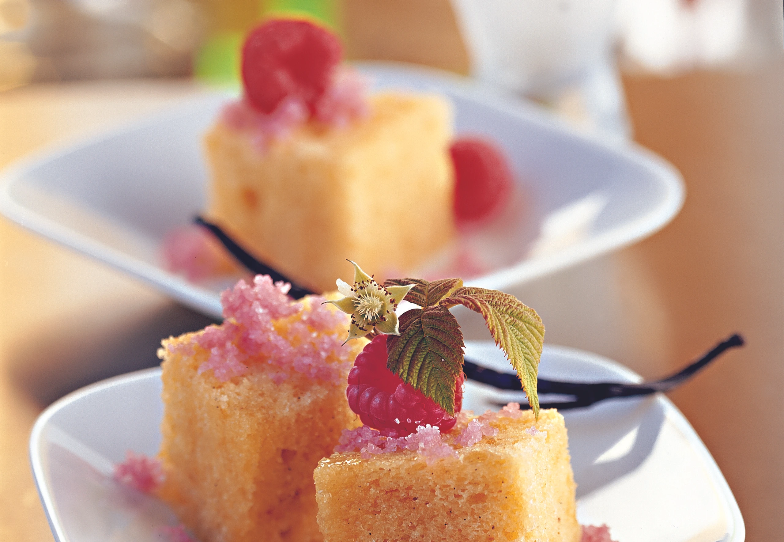 Kuchen in ca. 5 cm große Würfel schneiden, mit Wodka-Vanille-Sirup tränken und mit Himbeerzucker bestreuen. Eventuell mit frischen Himbeeren garnieren.