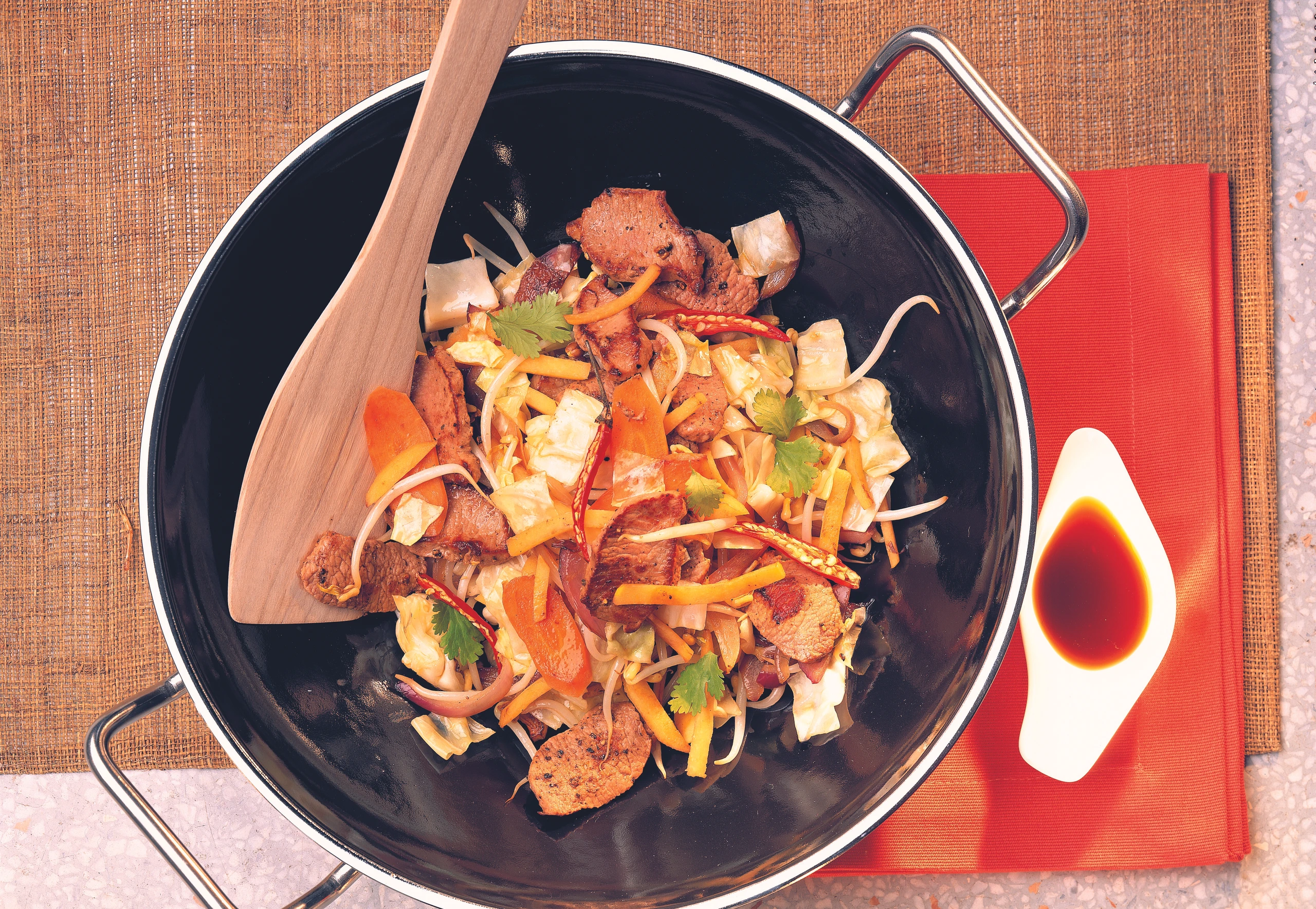 - Karotten und Kraut in den Wok geben und unter Rühren kurz anrösten, dann Zwiebel, Quitte, Sojasprossen zugeben, das restliche Öl vom Wokrand her langsam zugießen. Gemüse kurz rösten. Chili, rosa Beeren, etwas Sojasauce, Koriander und Petersilie untermengen, eventuell etwas salzen. Fleisch untermischen. Dazu passt Reis.