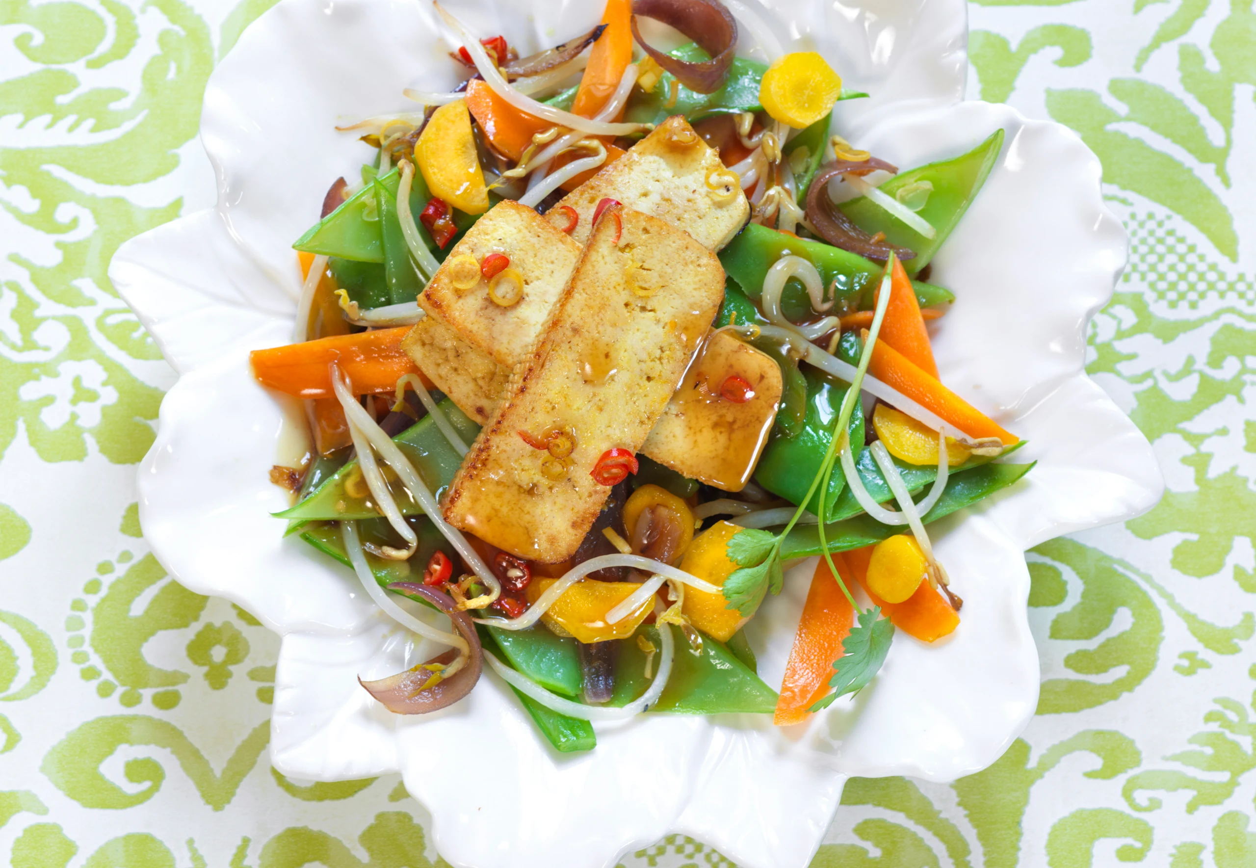 Wokgemüse mit Chili-Zitronengras-Tofu anrichten, mit geschnittenem Koriander bestreuen.