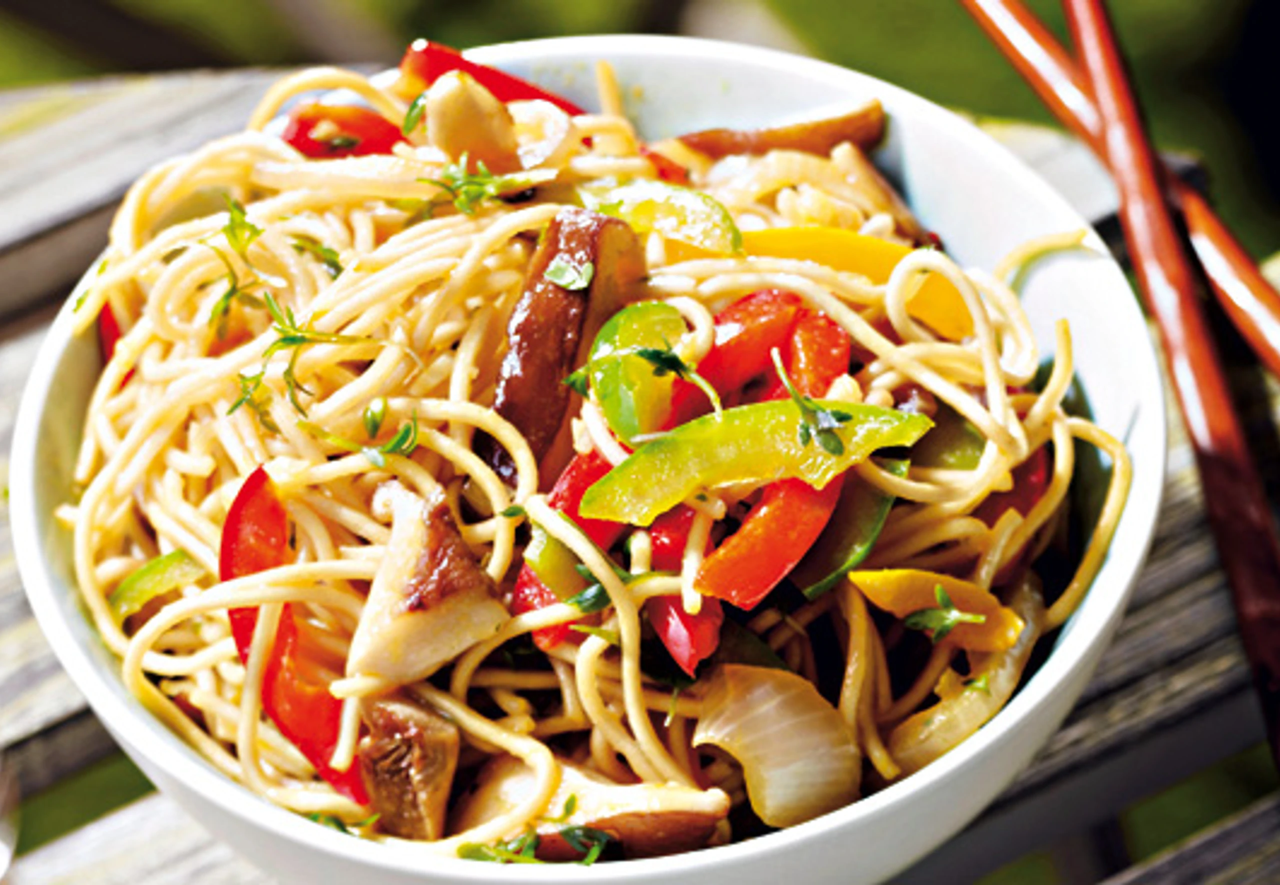 Wok oder beschichtete Pfanne erhitzen. Gemüse darin bei starker Hitze ca. 2 Minuten braten; dabei öfter wenden. Chili einrühren. Nudeln und Sojasauce untermischen. Gemüse kurz erhitzen, salzen und pfeffern. Nudeln mit Gemüse anrichten und mit Kresse bestreut servieren.